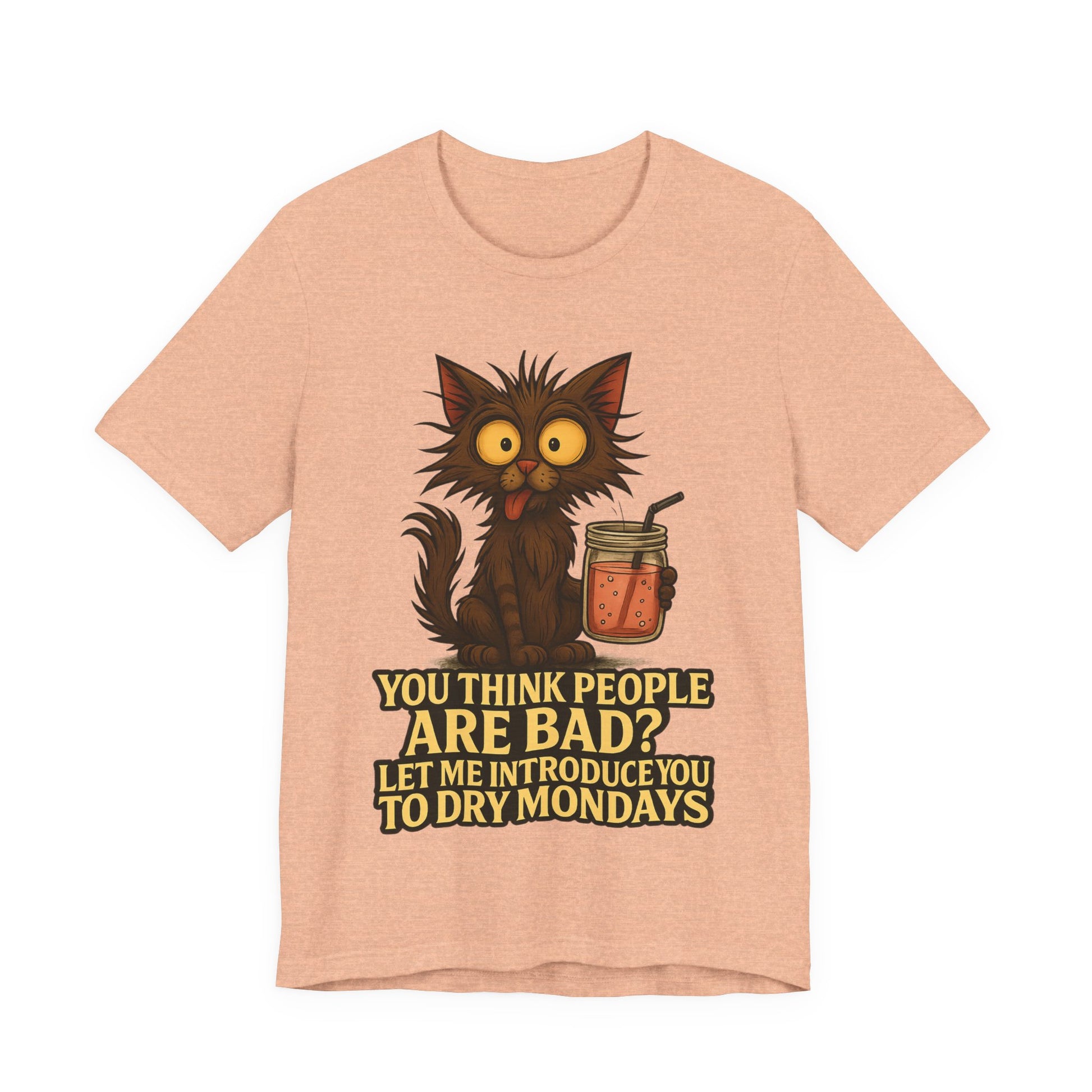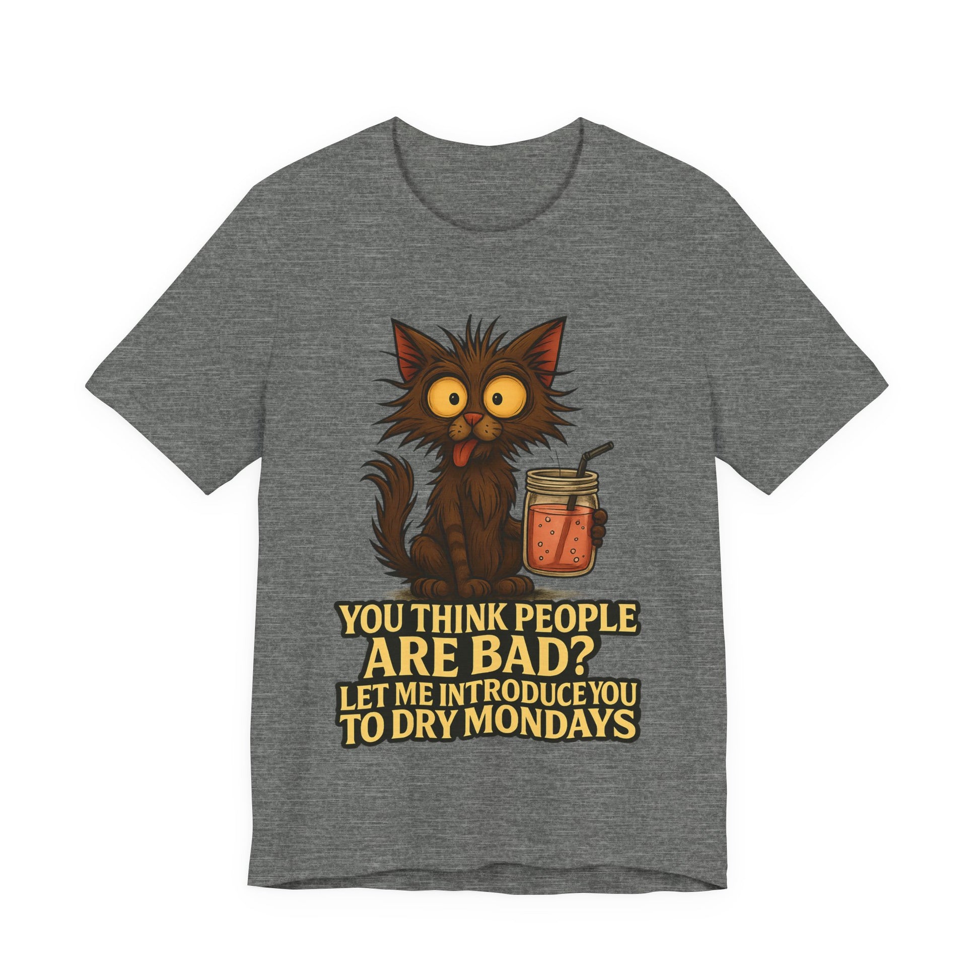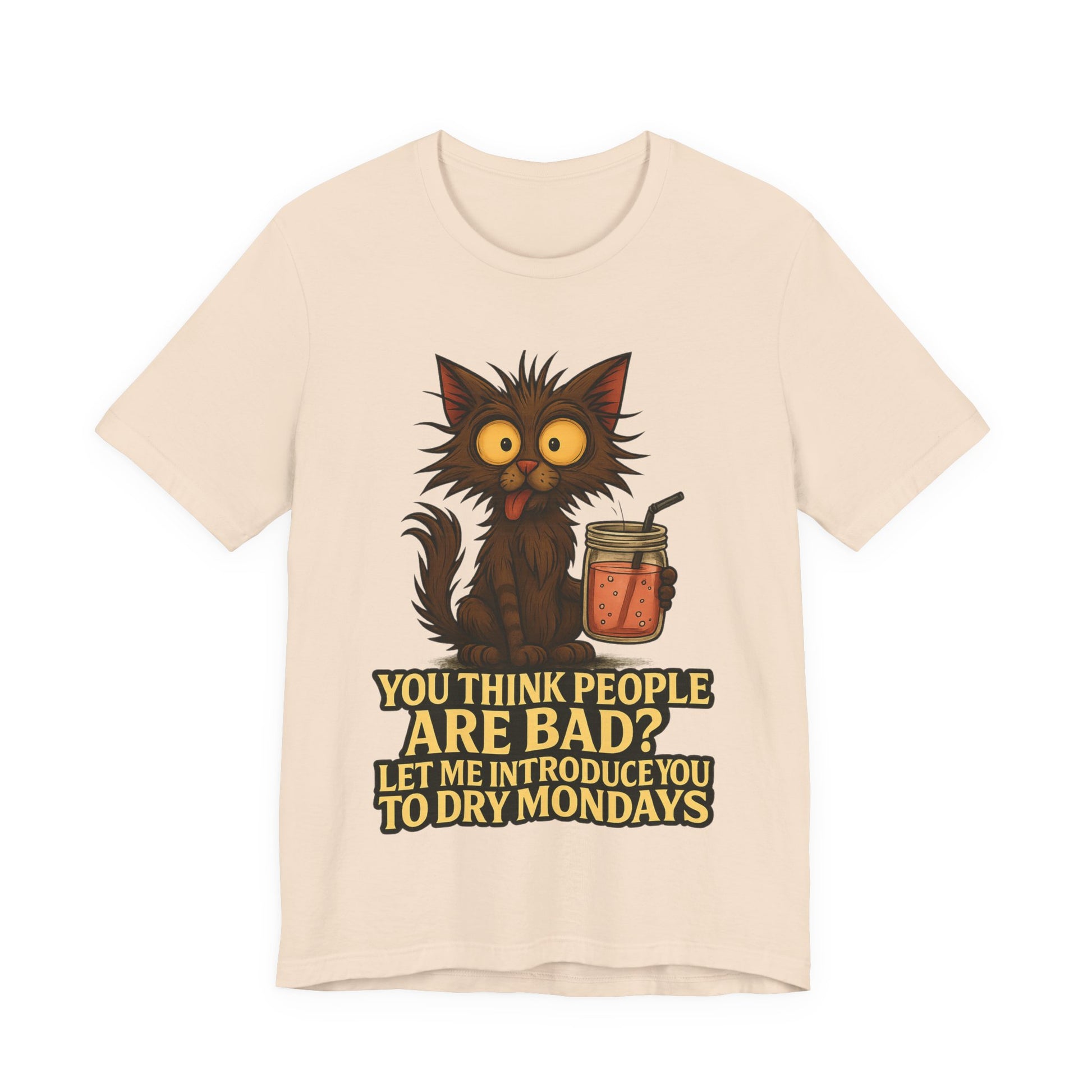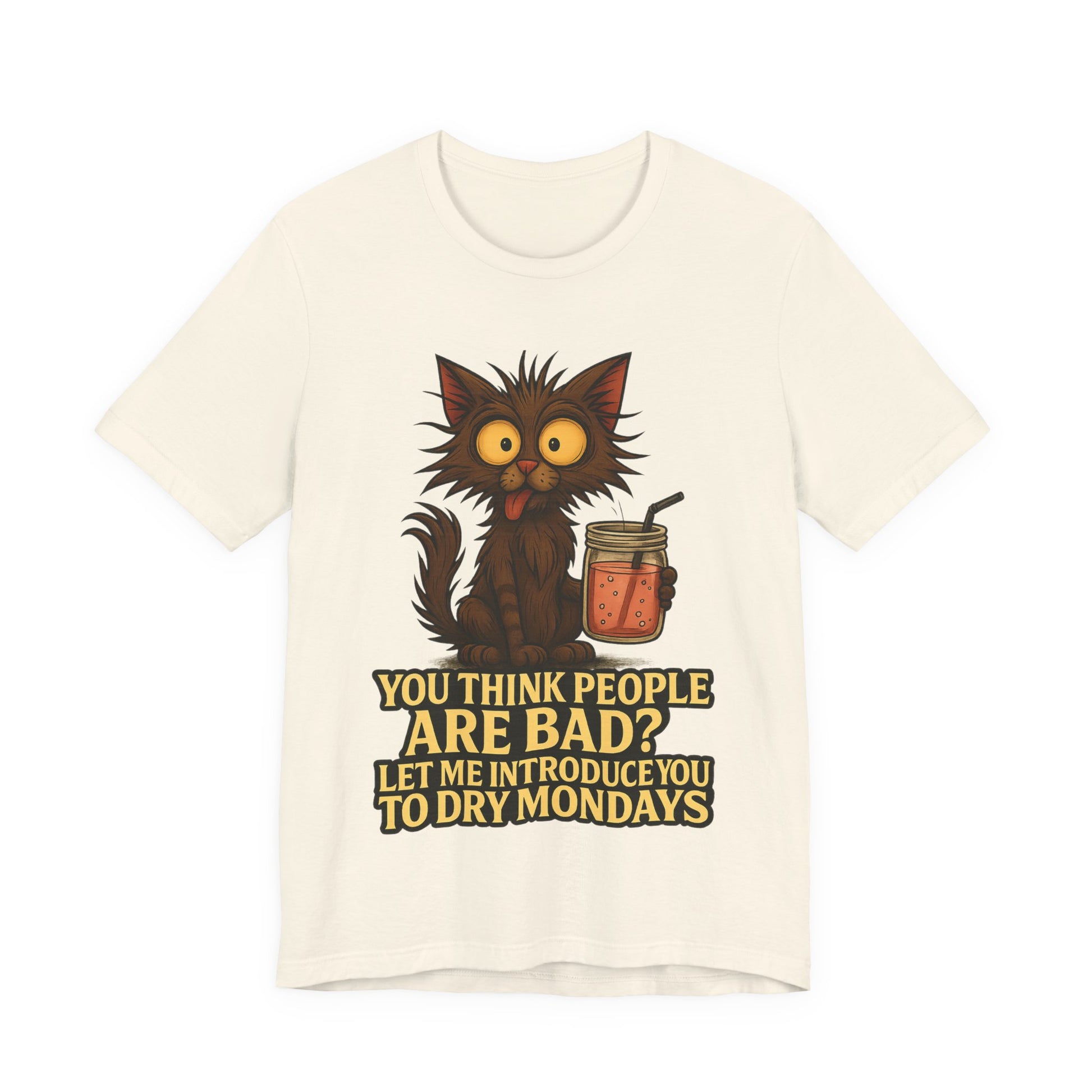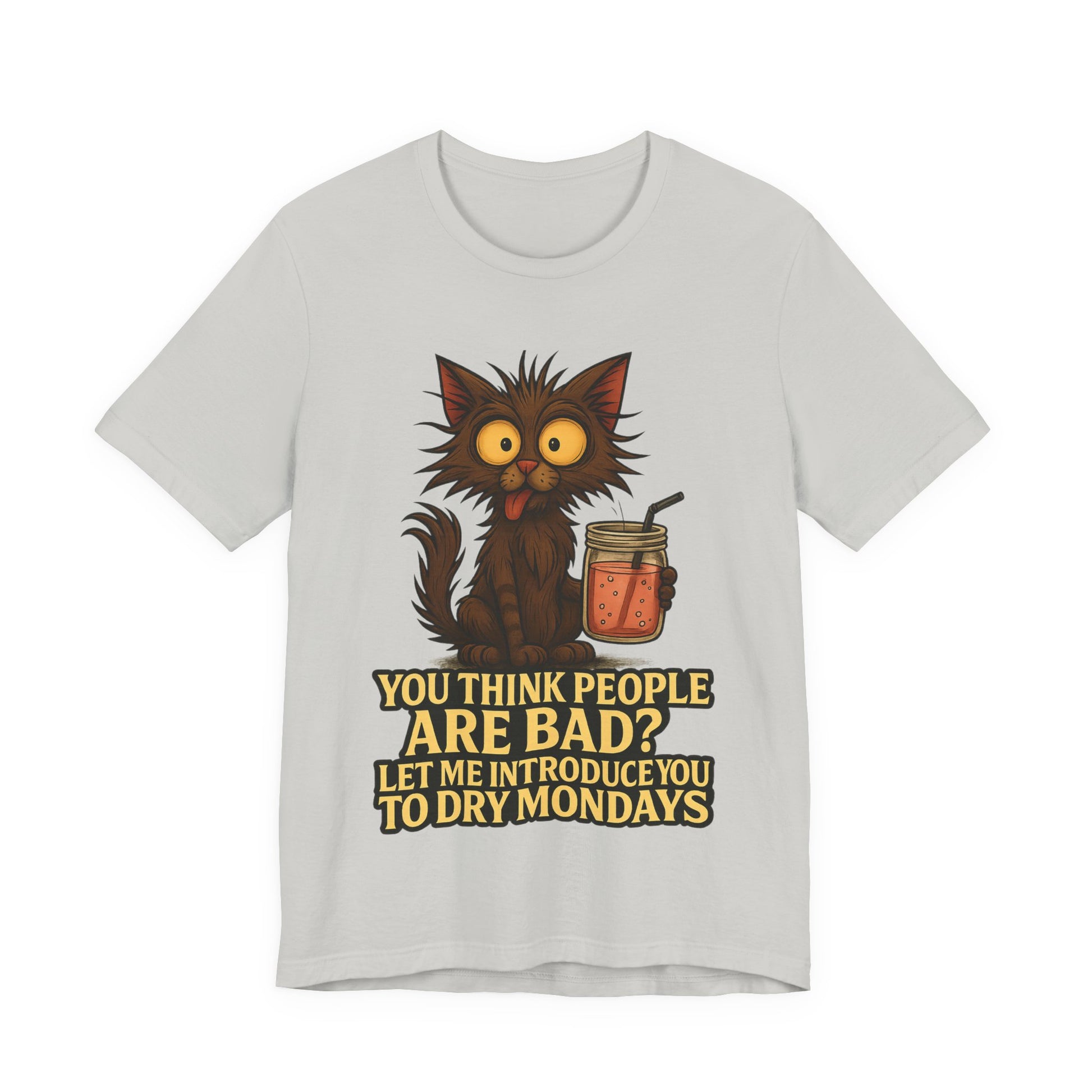 Dry Mondays Cat T-Shirt – Funny Cat Illustration with ‘You Think People Are Bad? Let Me Introduce You to Dry Mondays’ Slogan