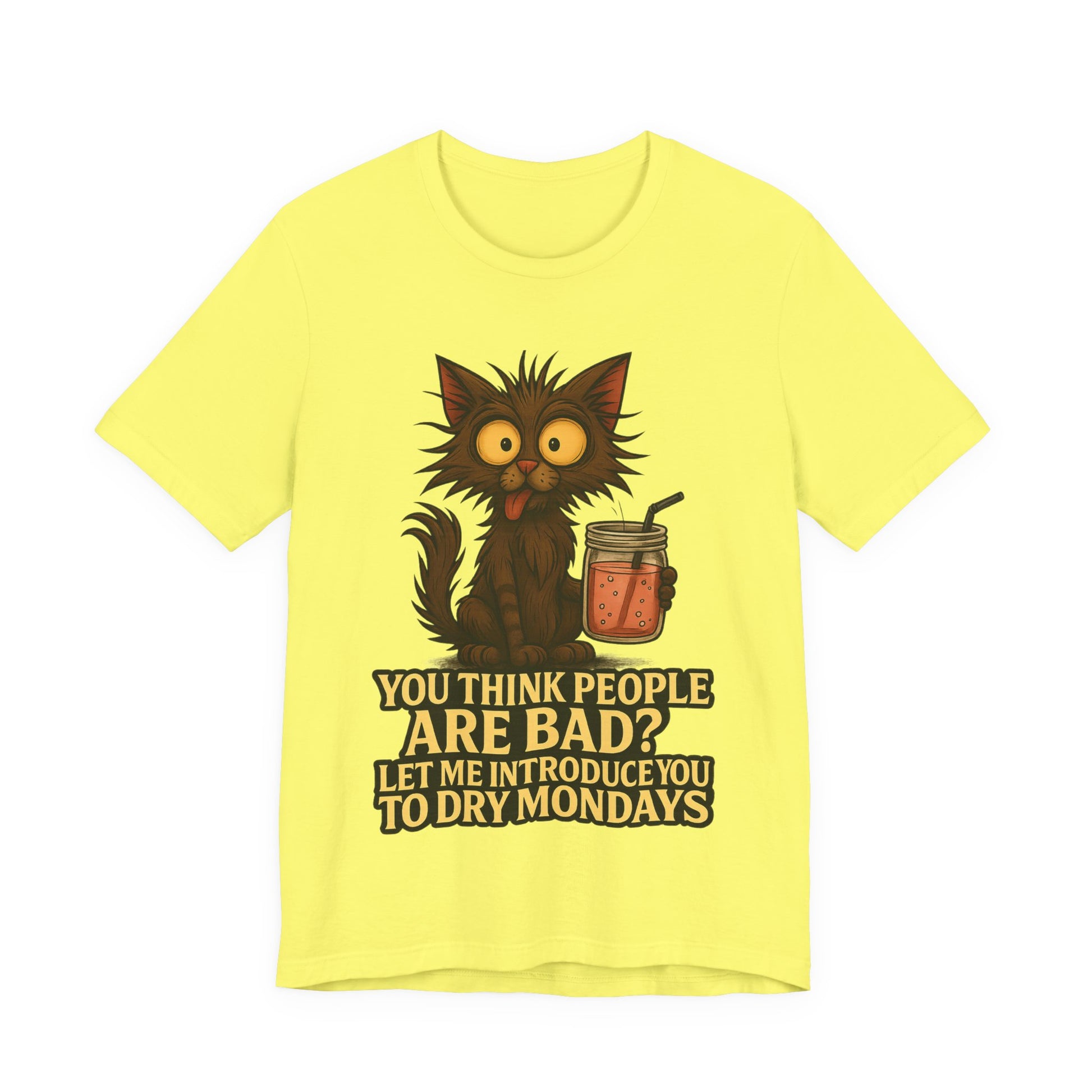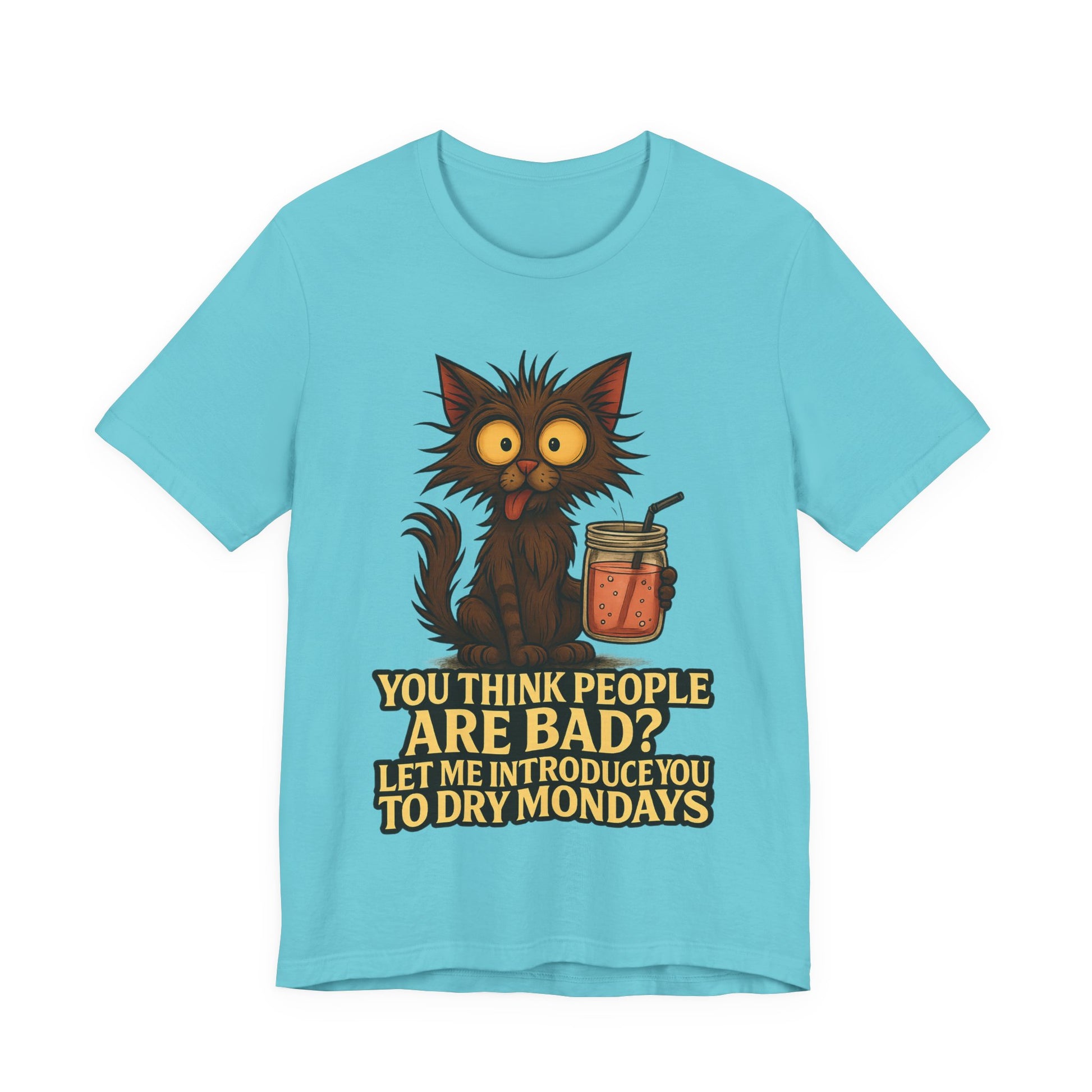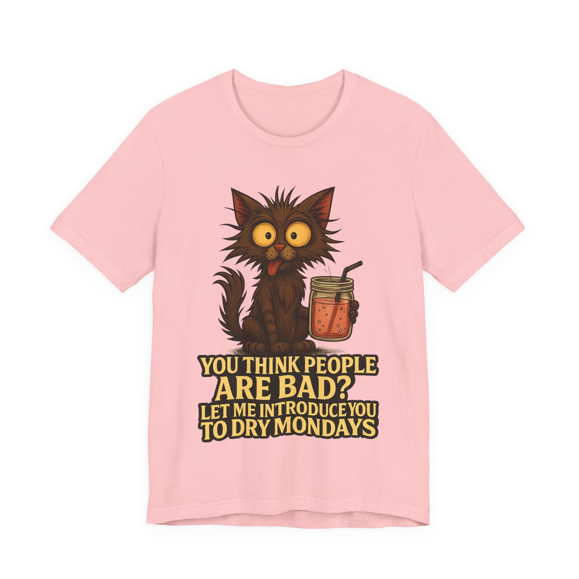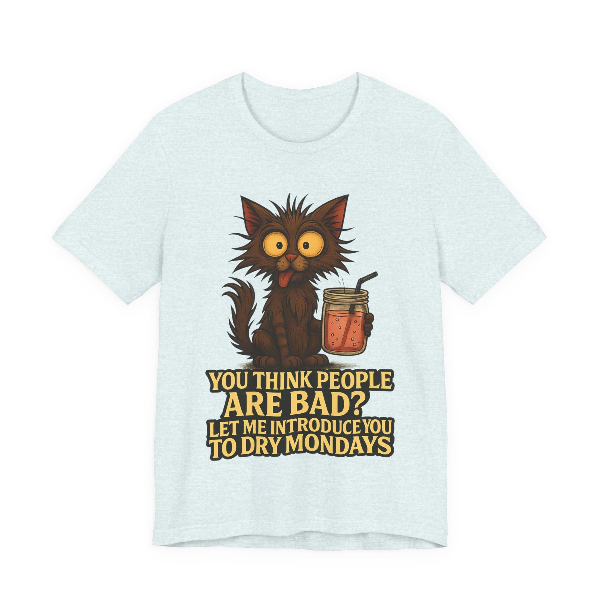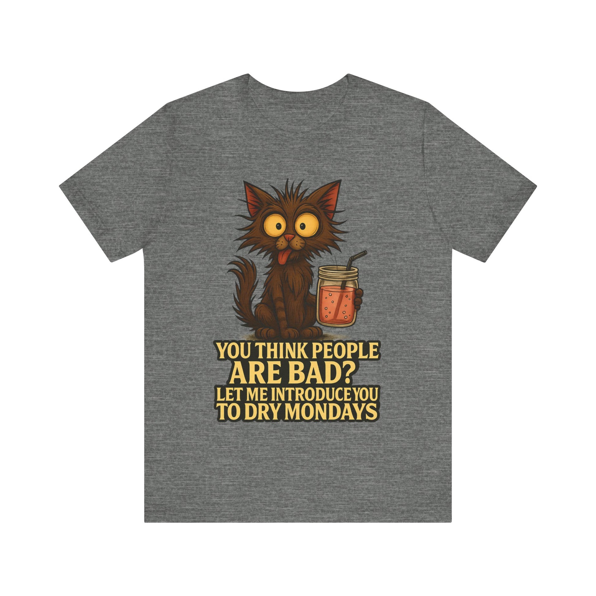 Dry Mondays Cat T-Shirt – Funny Cat Illustration with ‘You Think People Are Bad? Let Me Introduce You to Dry Mondays’ Slogan