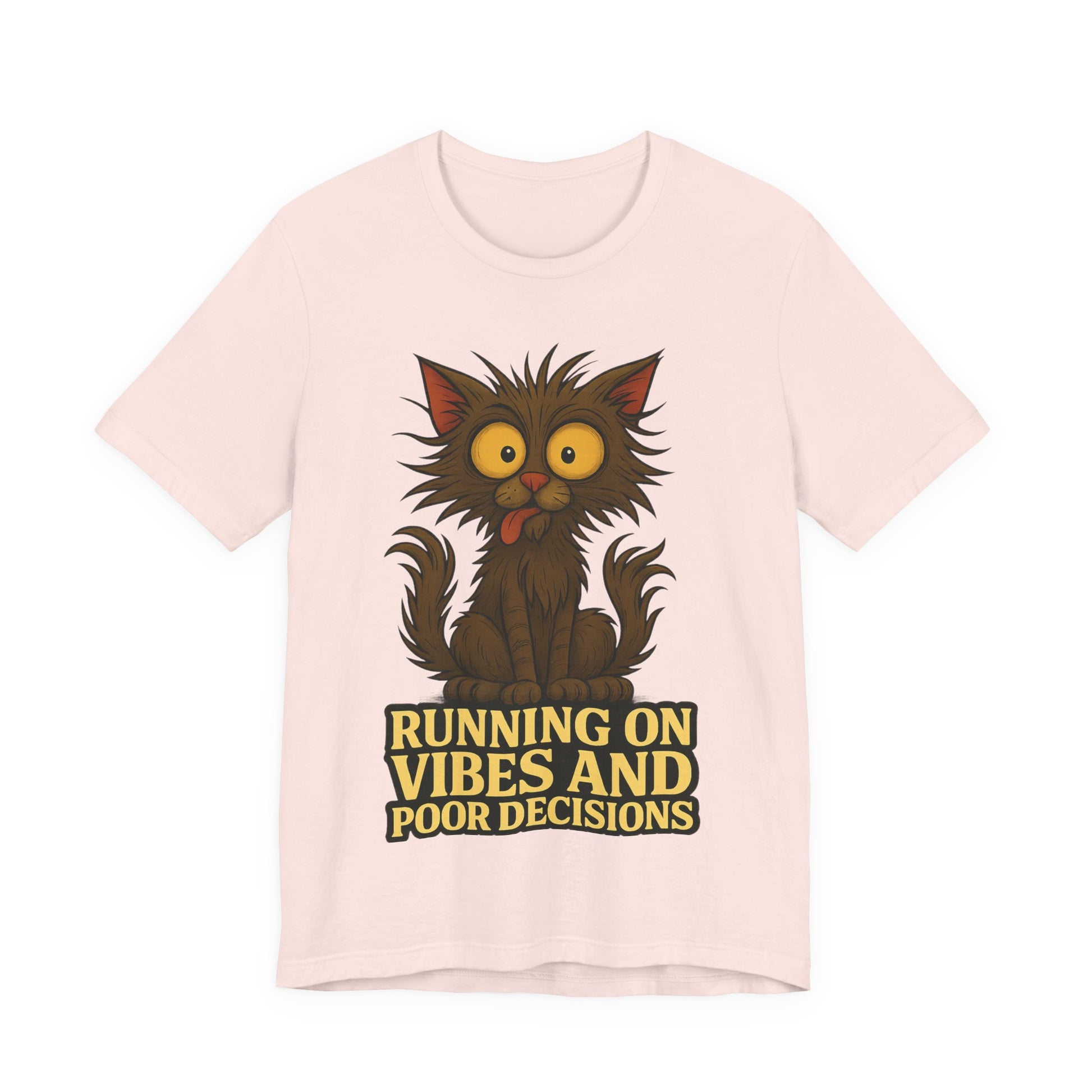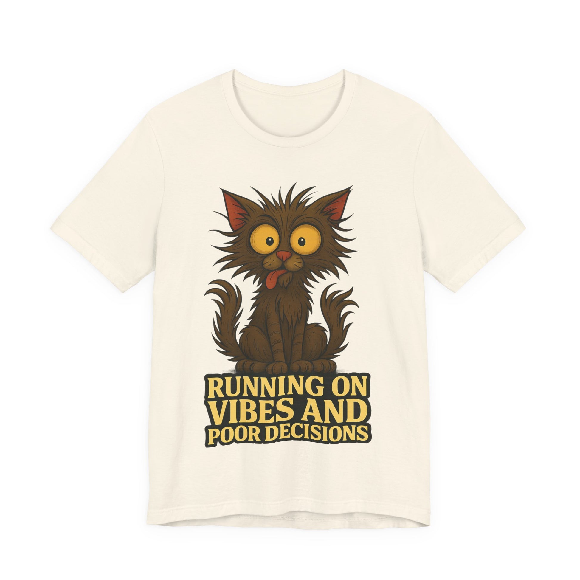 Funny Cat T-Shirt — "Running on Vibes and Poor Decisions" Graphic Tee