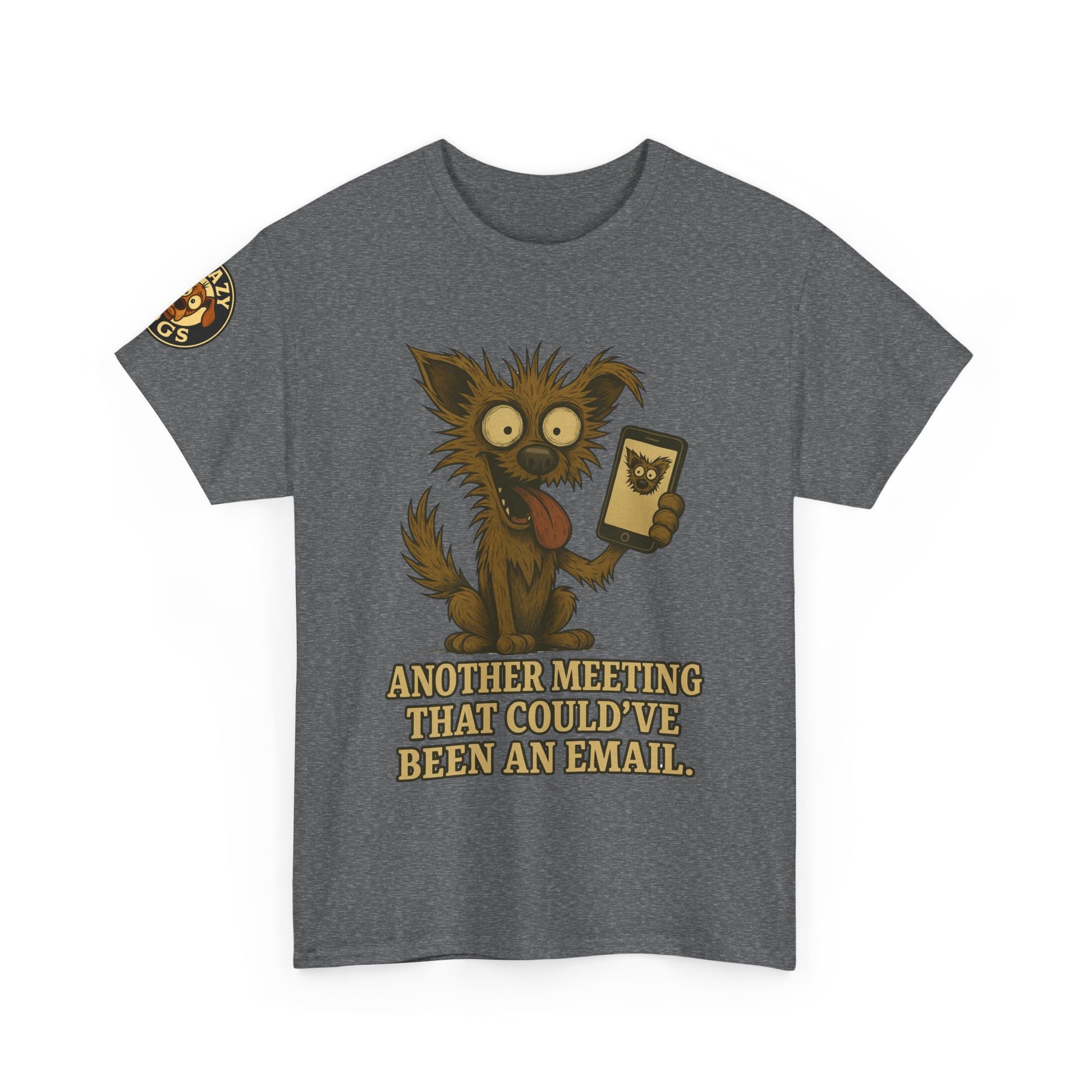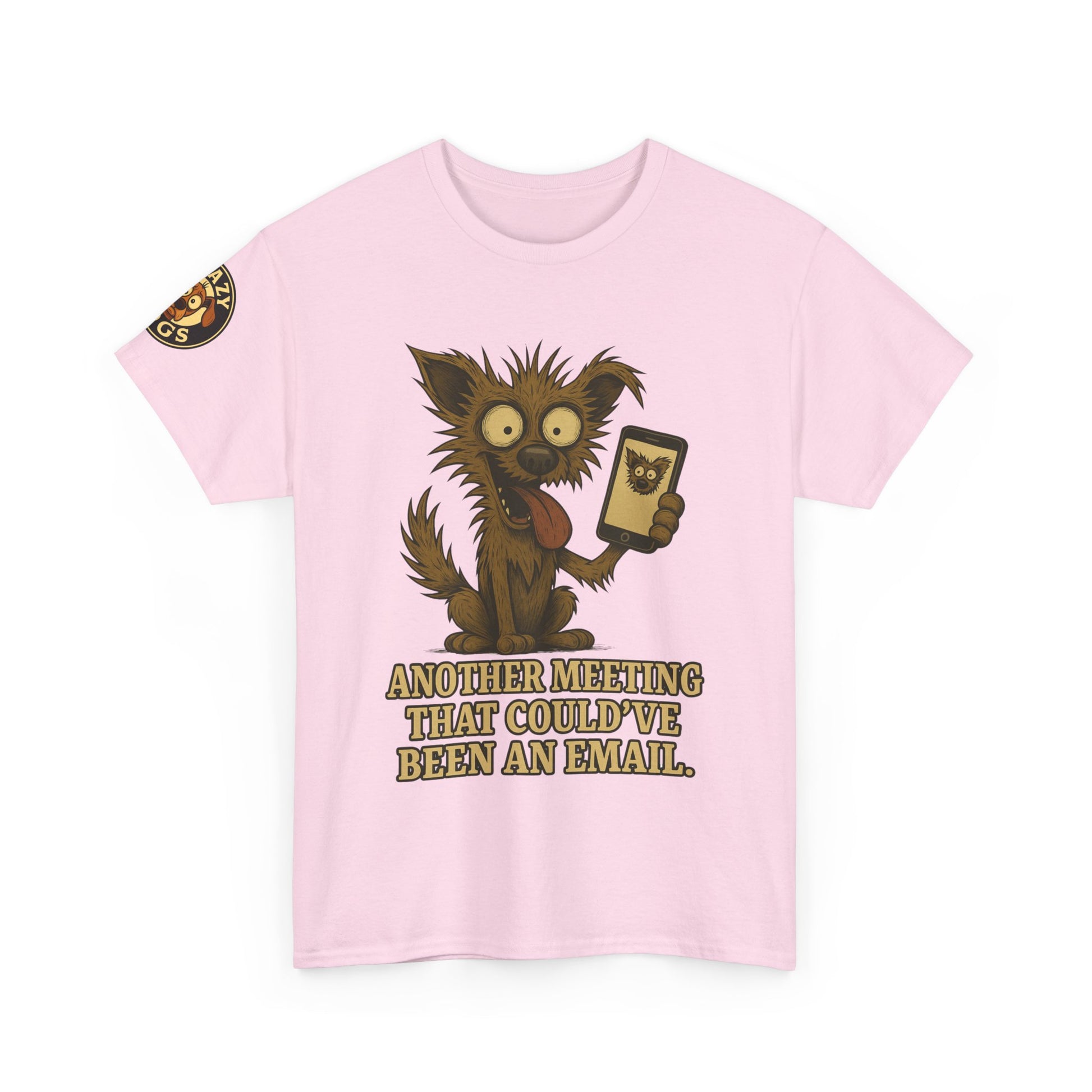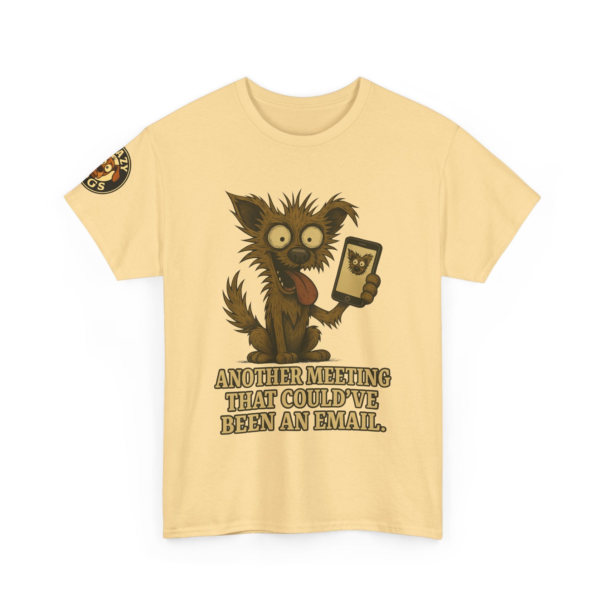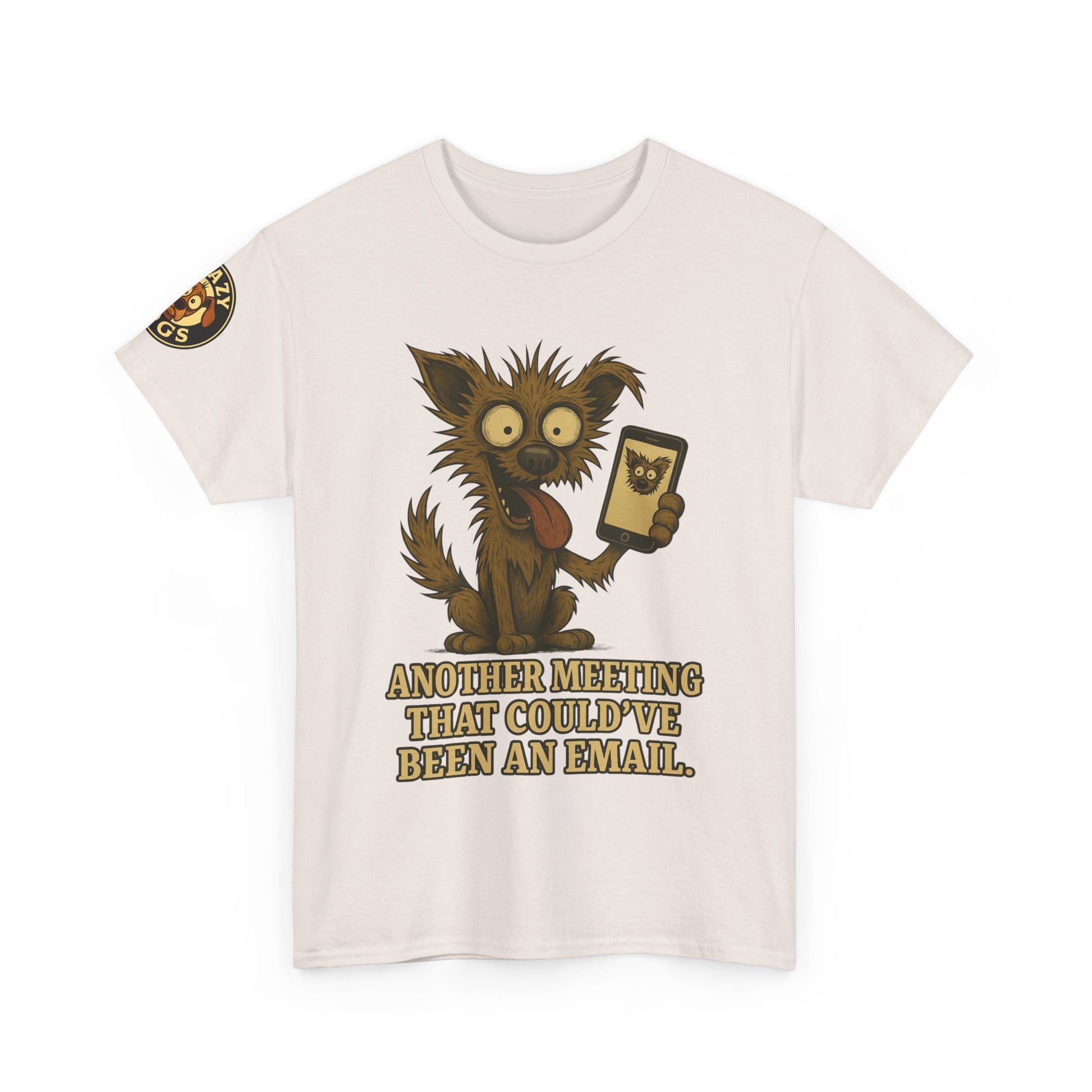 This soft, classic-fit tee carries a bit of playful chaos — a wide-eyed, ragged pup holding up a phone with the caption “Another meeting that could’ve been an email.” It’s the kind of shirt that makes coworkers laugh in the break room and starts conversations at remote meetups. Wear it to commute days, casual Fridays, or while you’re logging on from a home office to give your routine a wink of humor. The medium-weight cotton feels familiar and sturdy, the ribbed collar keeps its shape through wash after wash, and the tear-away label keeps the neck comfortable when you’re moving from meeting to meeting. Subtle sleeve artwork adds a touch of personality at every angle, while crisp DTG/DTF prints keep the illustration detailed and resilient. For people who survive endless video calls, this tee reads like a quiet inside joke they’ll reach for again and again.