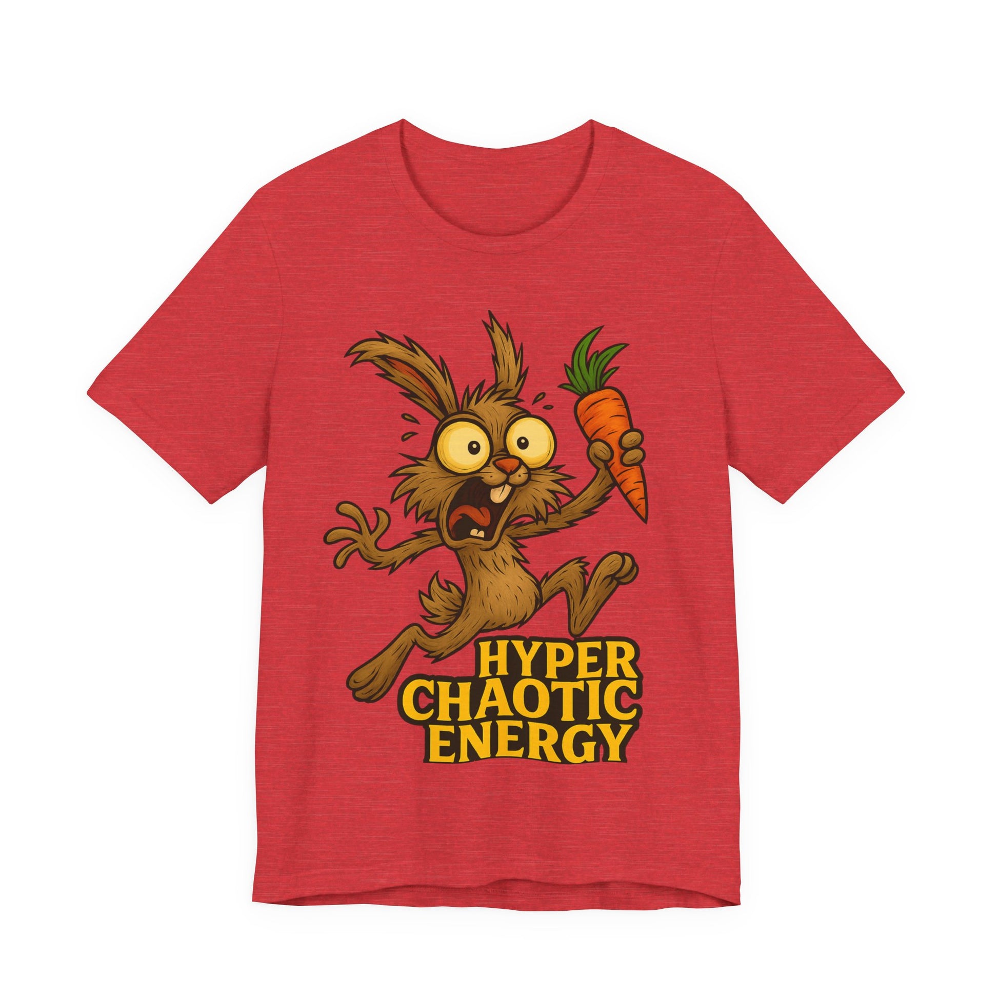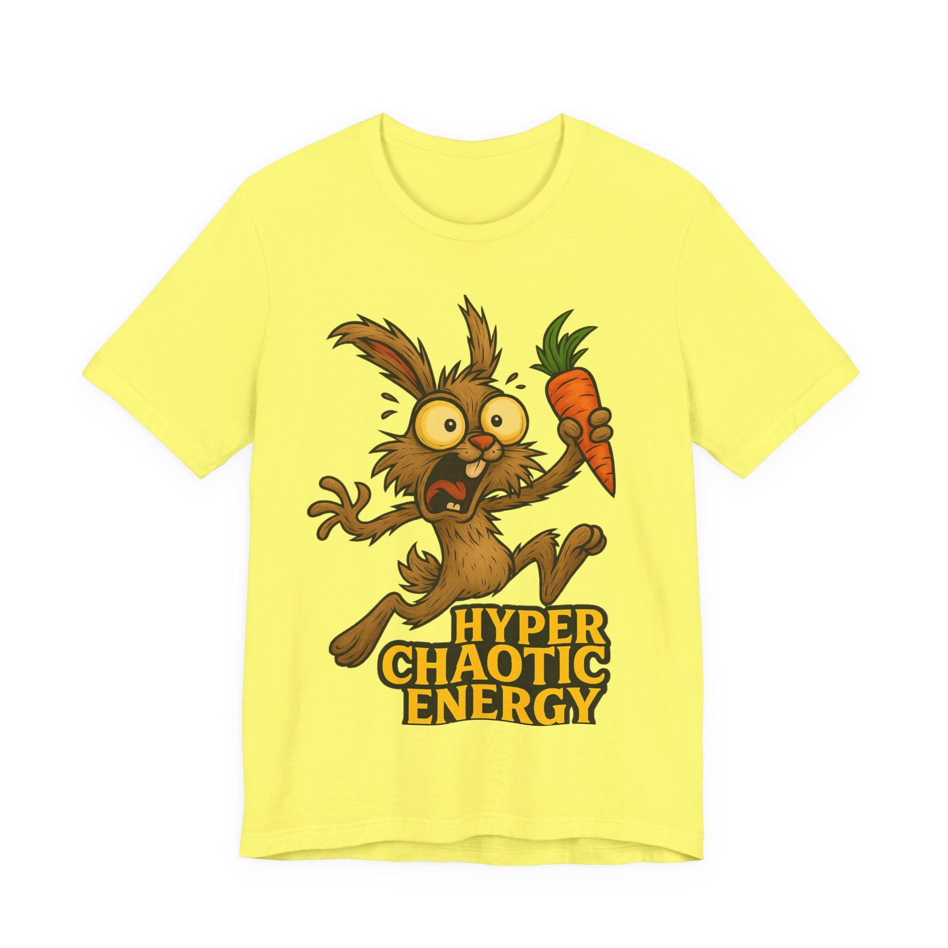 Hyper Chaotic Energy Bunny T-Shirt — Funny Cartoon Rabbit Holding Carrot Tee