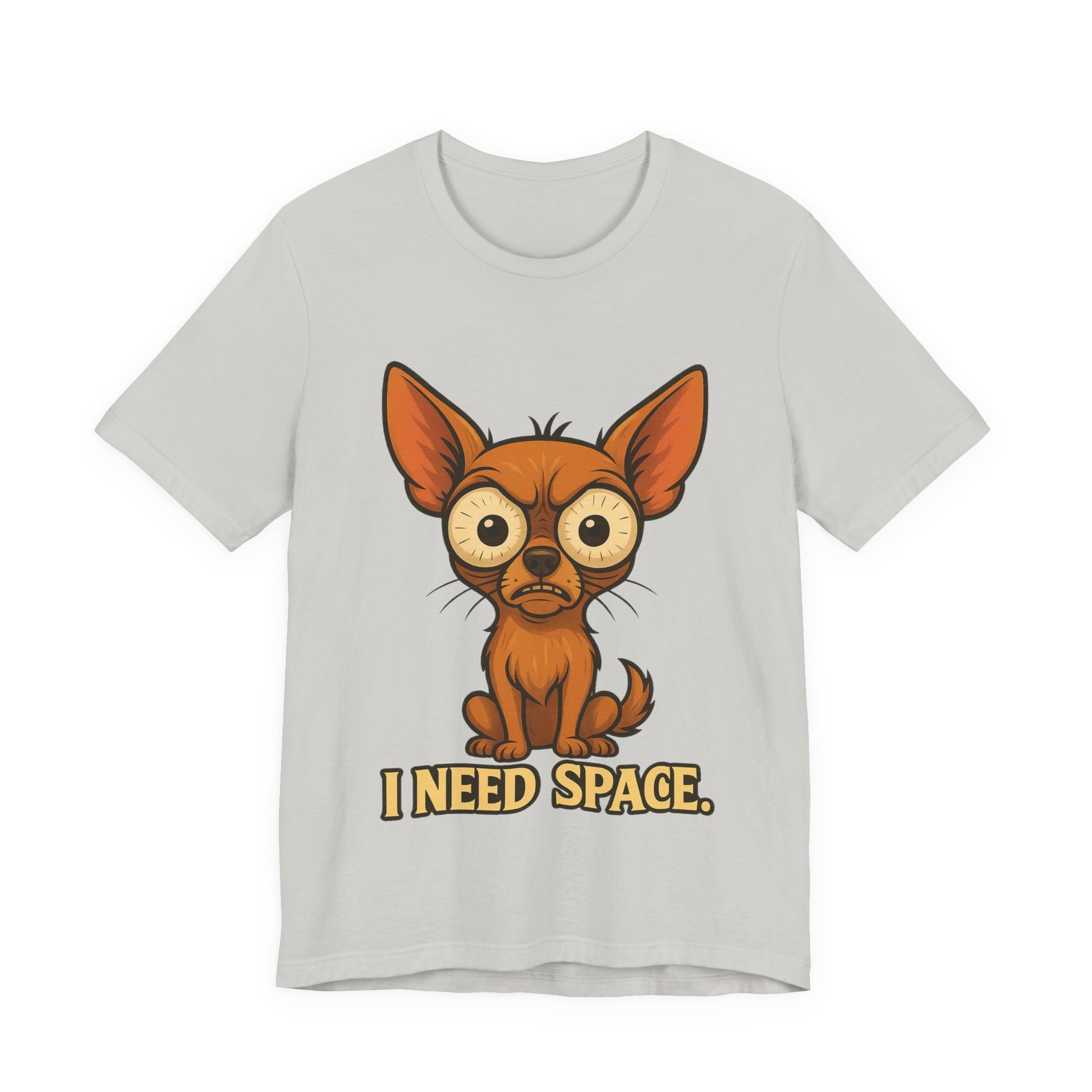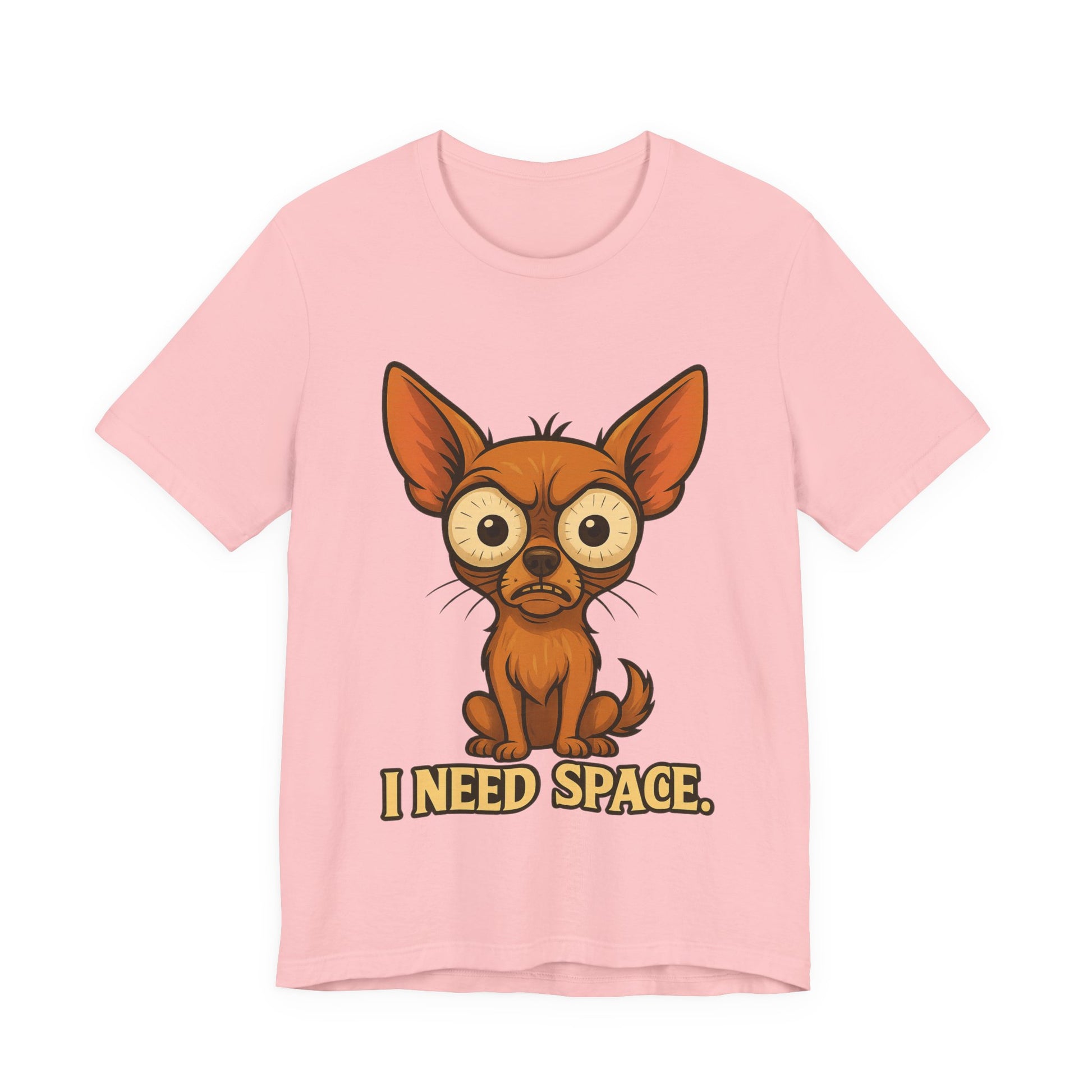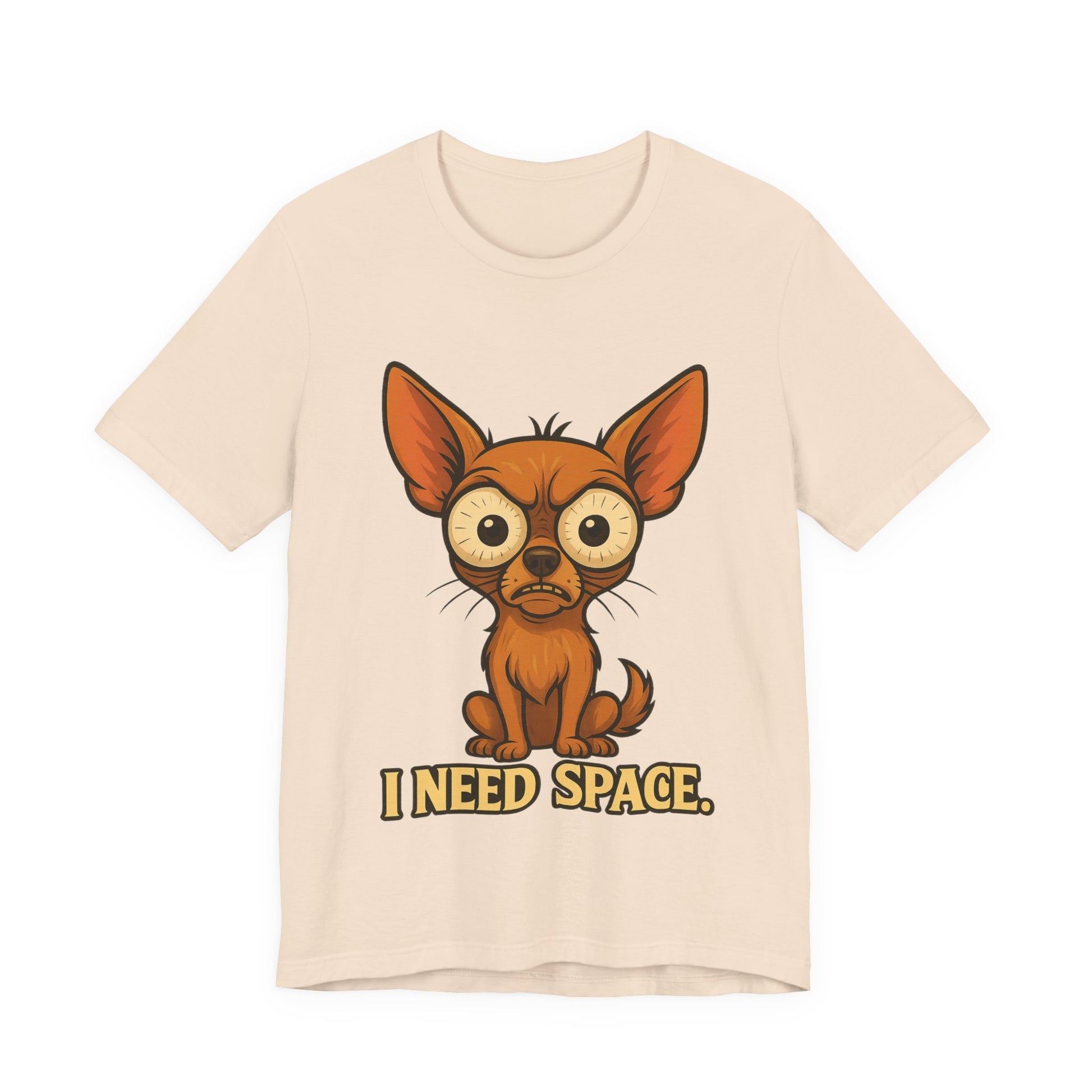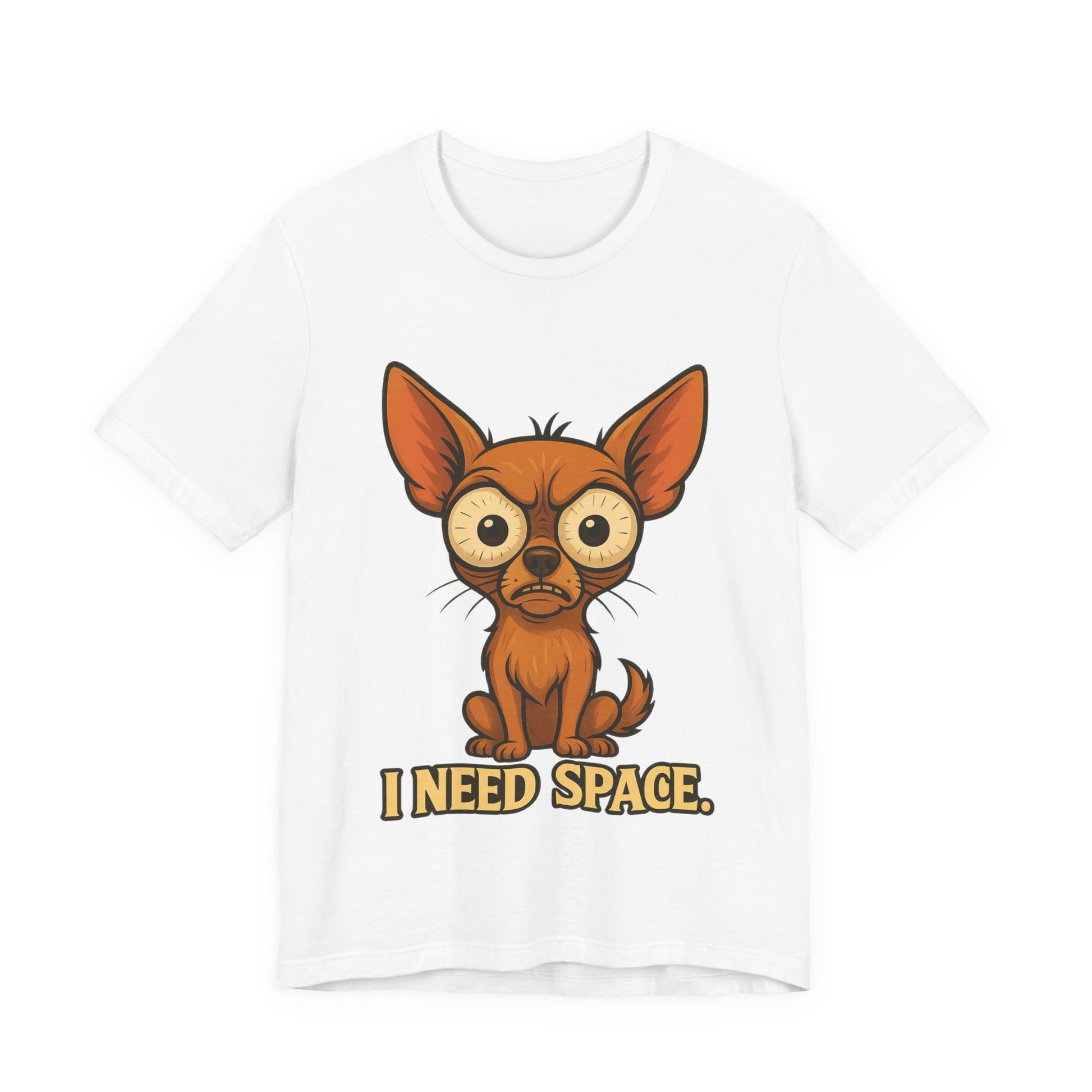 Lightweight and soft, this jersey tee carries a playful, slightly lonely vibe: a wide-eyed chihuahua portrait with the words “I NEED SPACE.” printed below. It sits cleanly on a classic crew neckline with side seams for structure and a tear-away label for comfort. The print is produced with crisp DTF/DTG methods so the illustration stays vibrant and detailed wash after wash. Wear it when you want to say ‘not today’ with a wink — casual enough for everyday layering, but neat enough to pair with a jacket or cardigan.