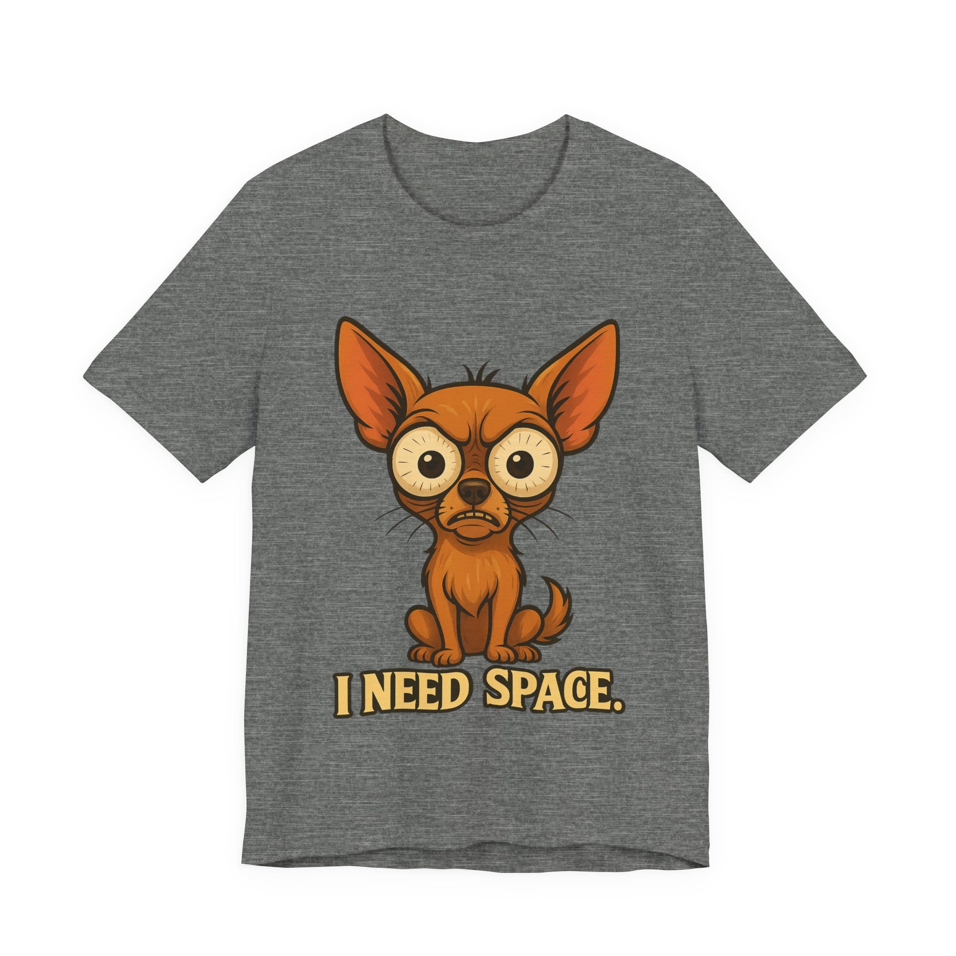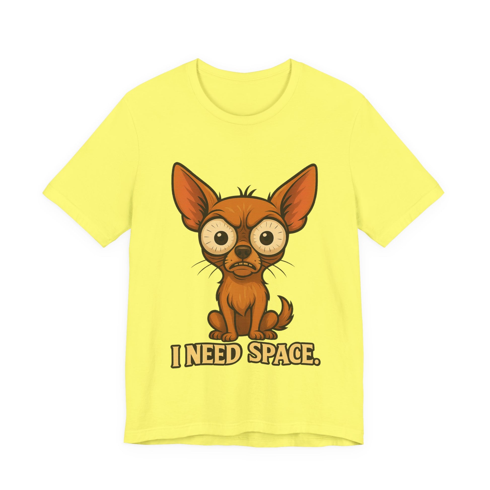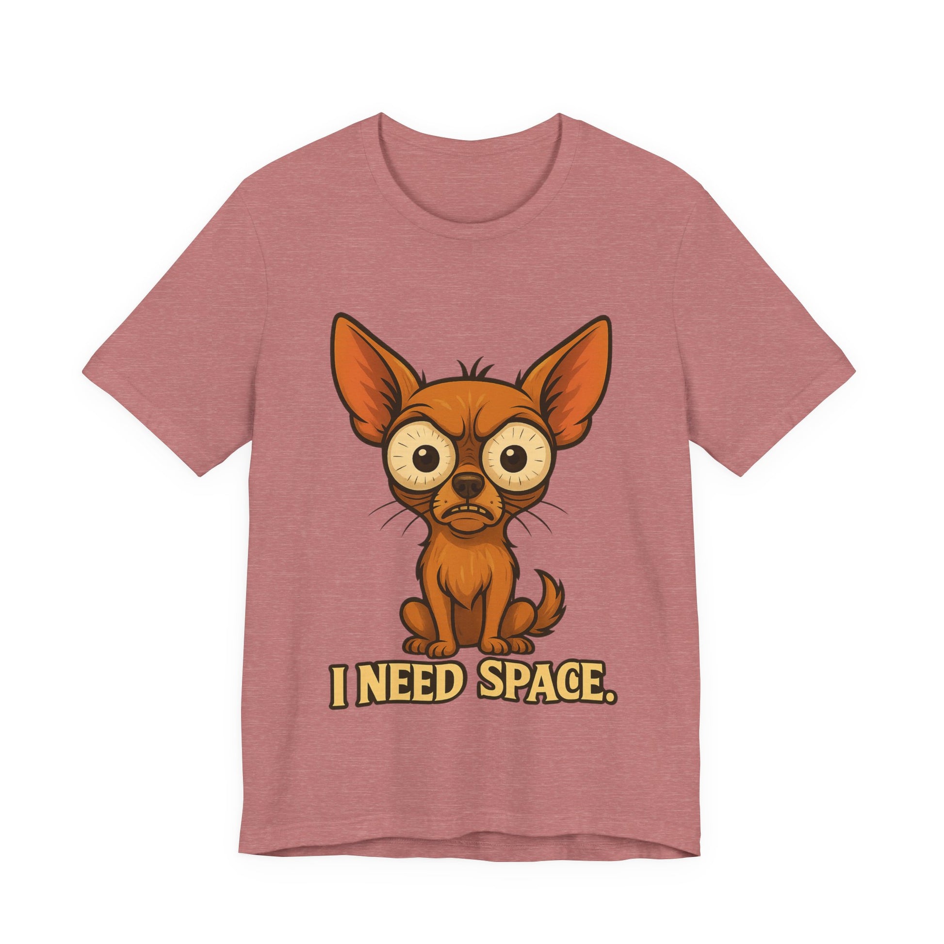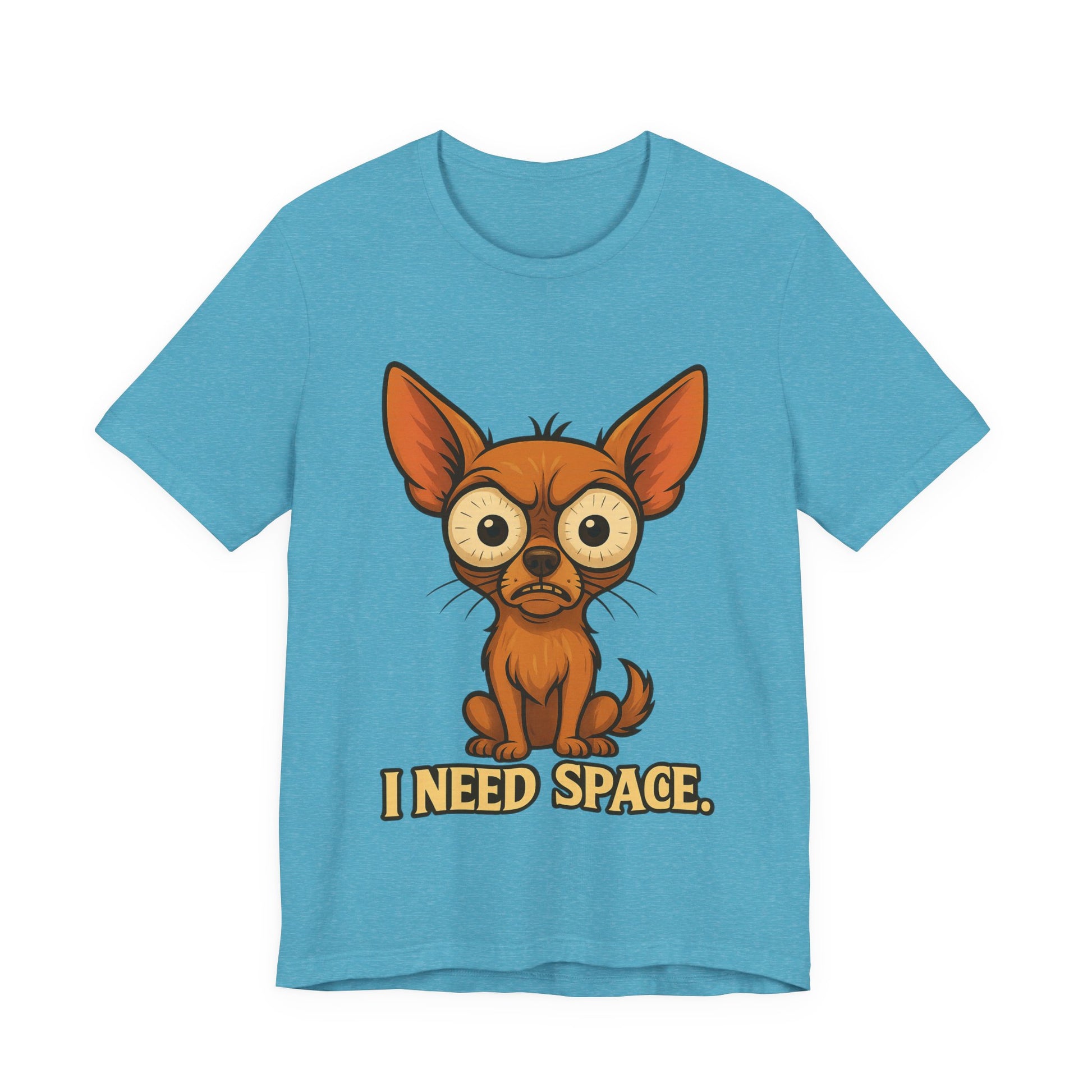 Lightweight and soft, this jersey tee carries a playful, slightly lonely vibe: a wide-eyed chihuahua portrait with the words “I NEED SPACE.” printed below. It sits cleanly on a classic crew neckline with side seams for structure and a tear-away label for comfort. The print is produced with crisp DTF/DTG methods so the illustration stays vibrant and detailed wash after wash. Wear it when you want to say ‘not today’ with a wink — casual enough for everyday layering, but neat enough to pair with a jacket or cardigan.