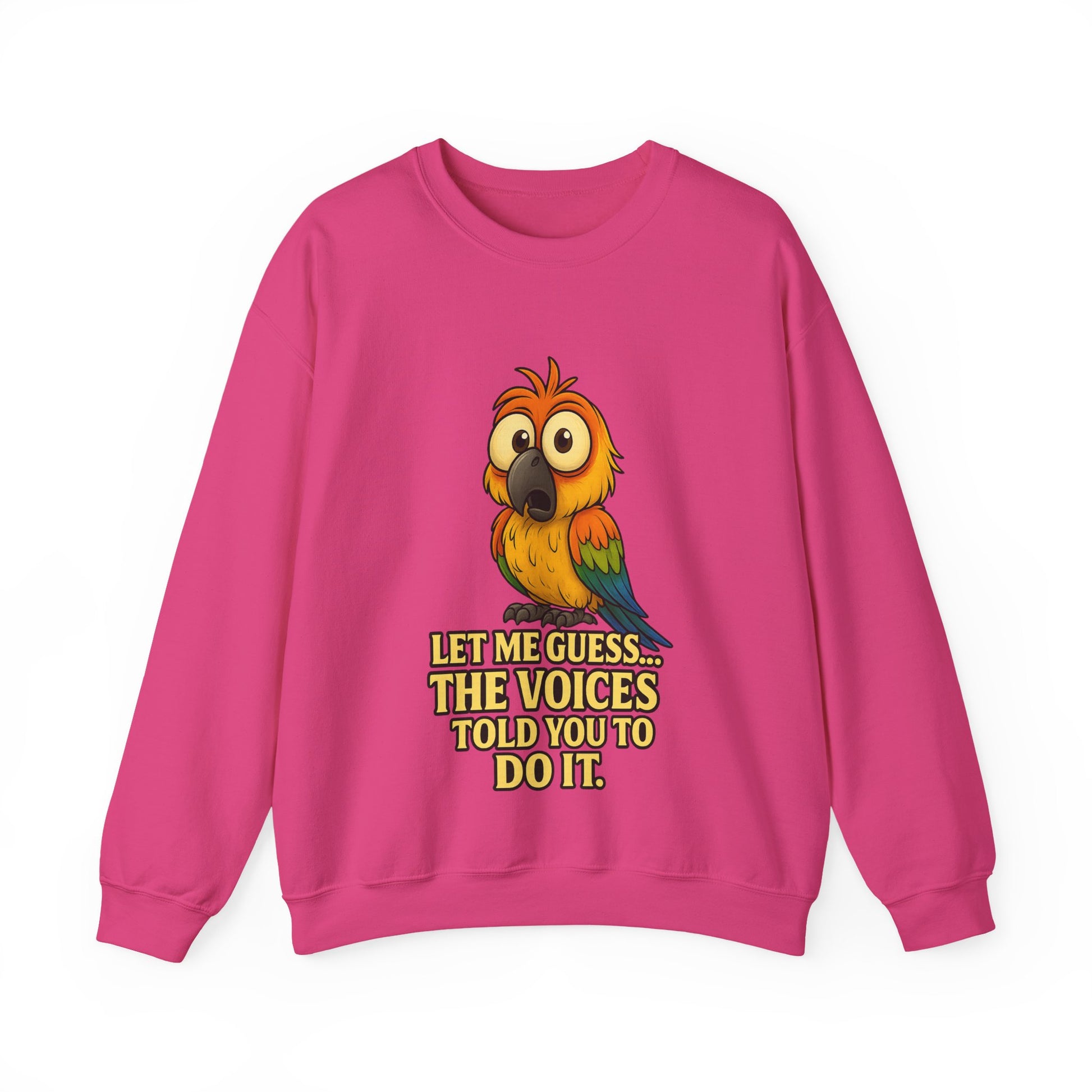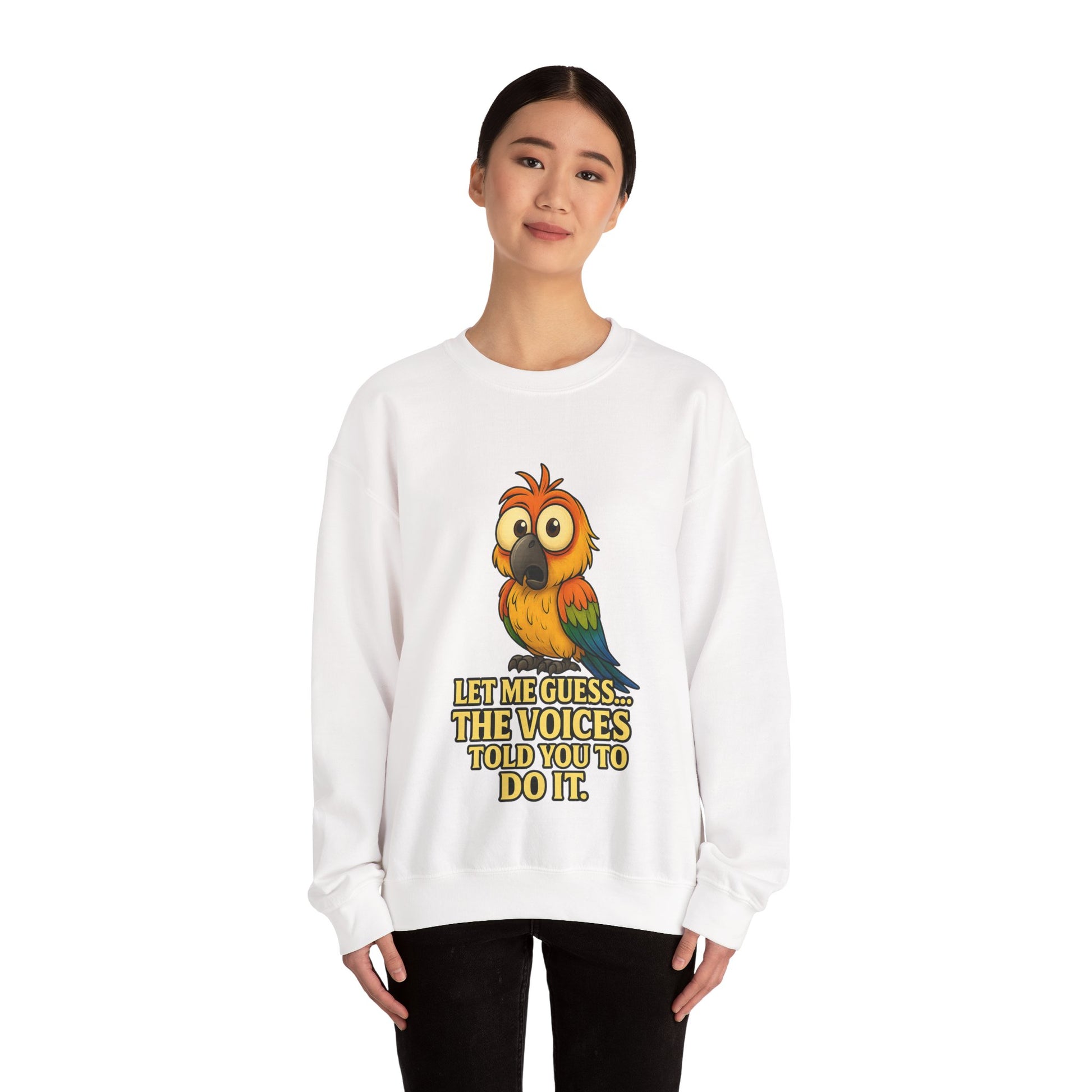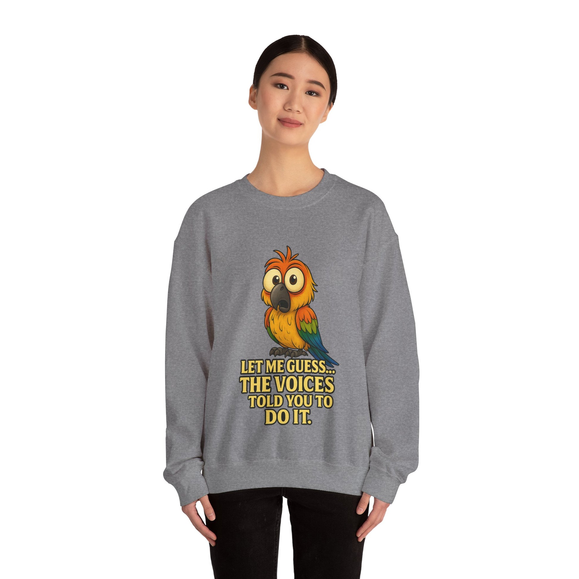 Parrot Crewneck Sweatshirt – “Let Me Guess… The Voices Told You To Do It” Graphic