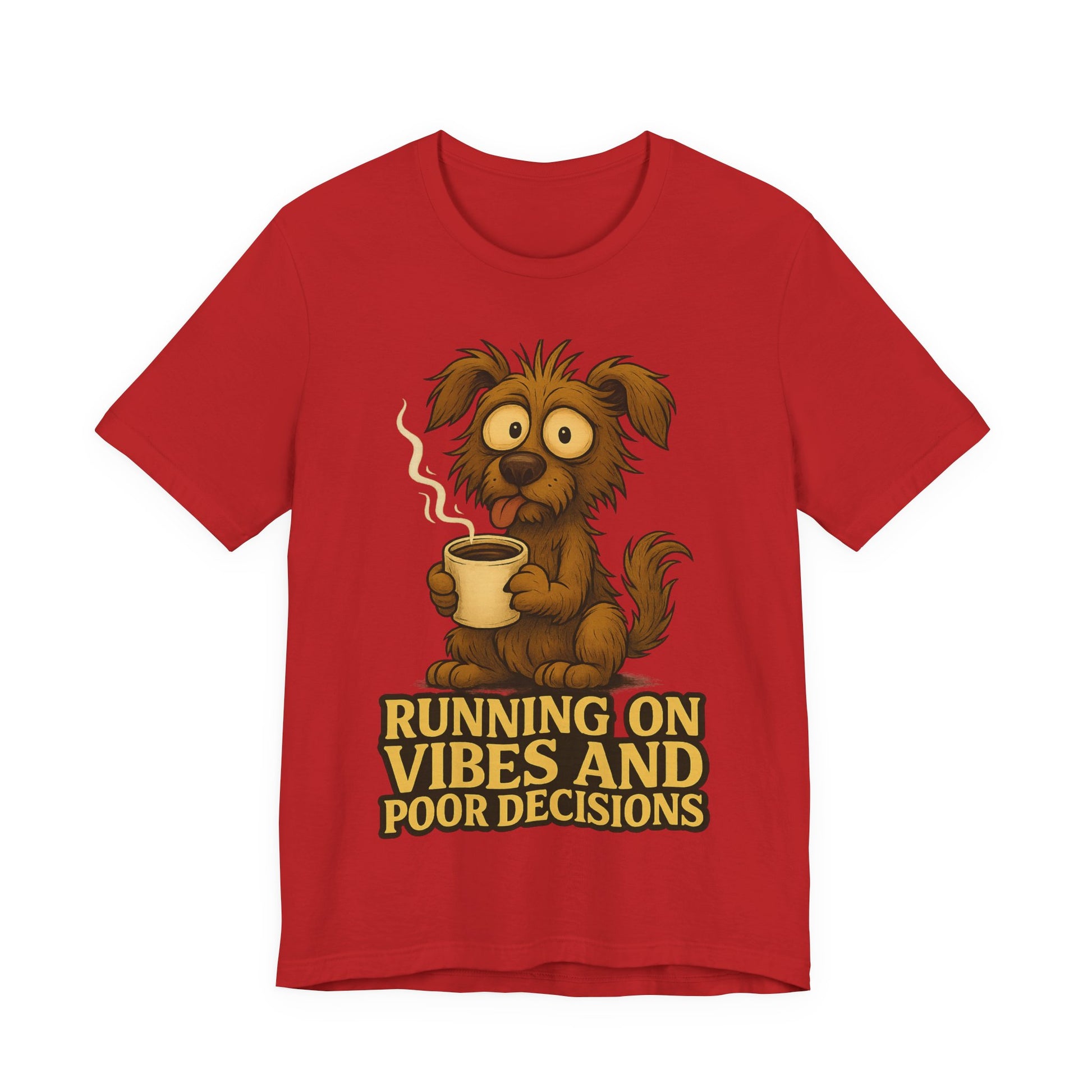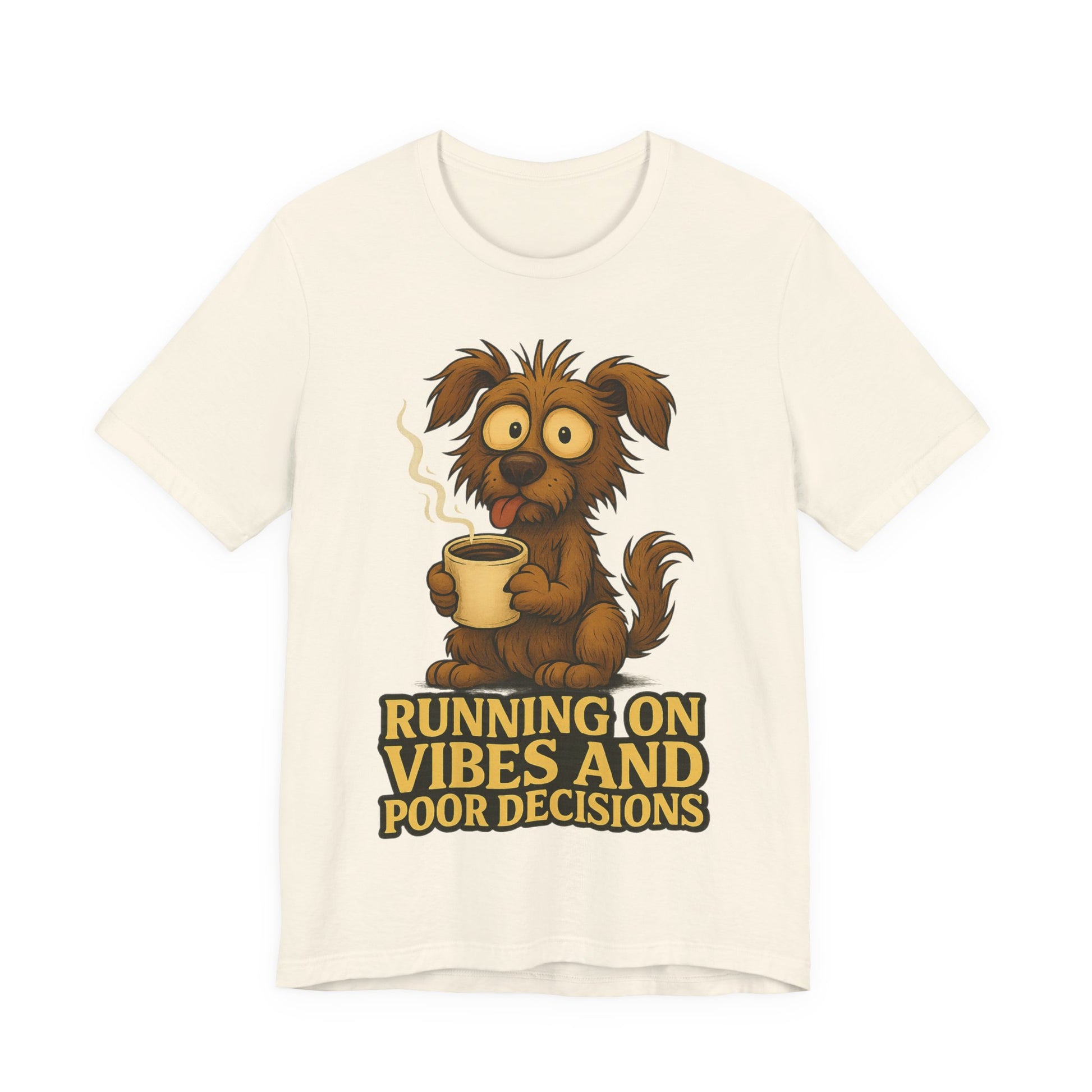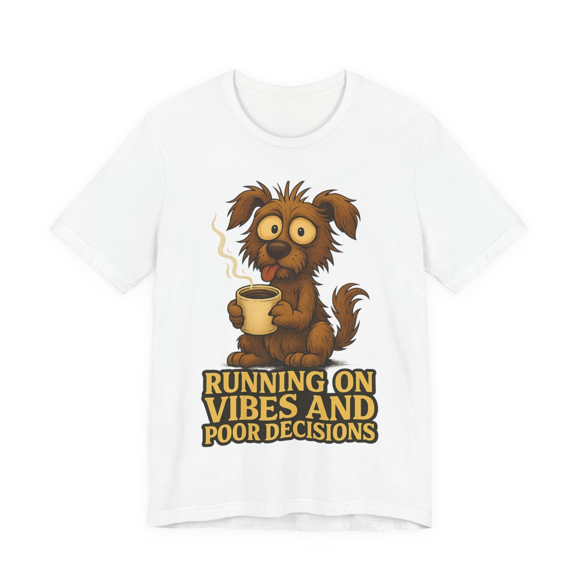Running on Vibes and Poor Decisions Tee — Funny Coffee Dog Graphic T-Shirt