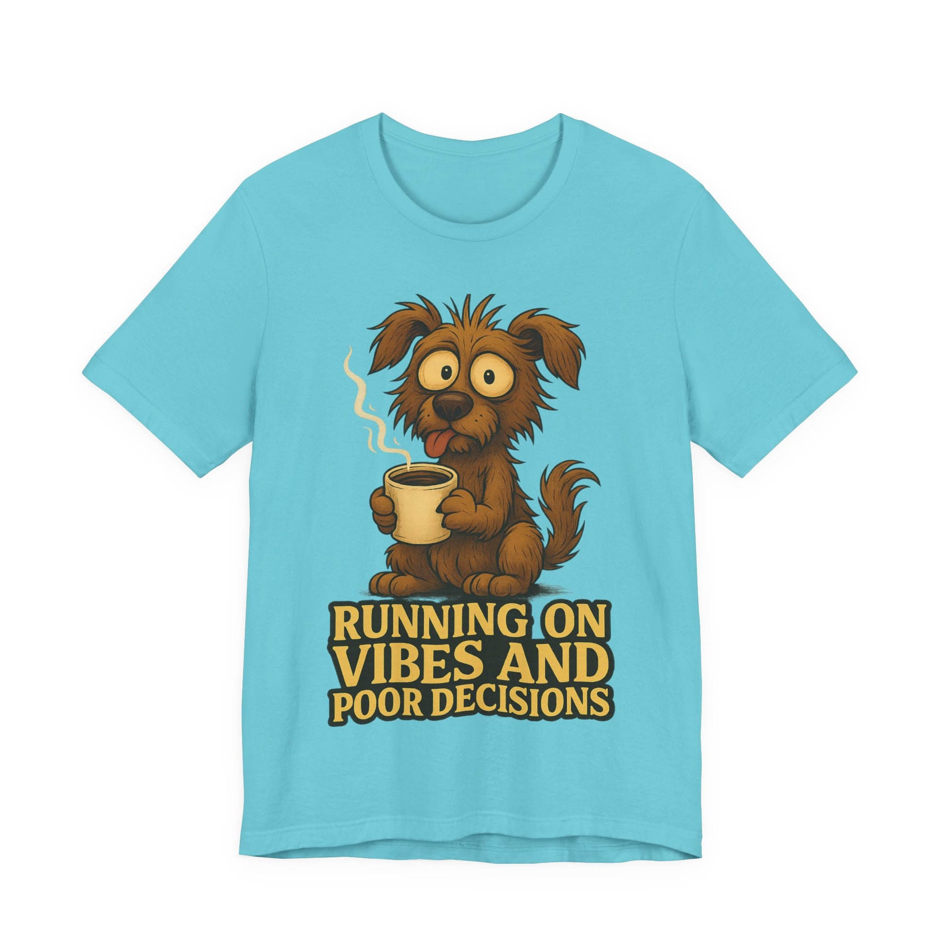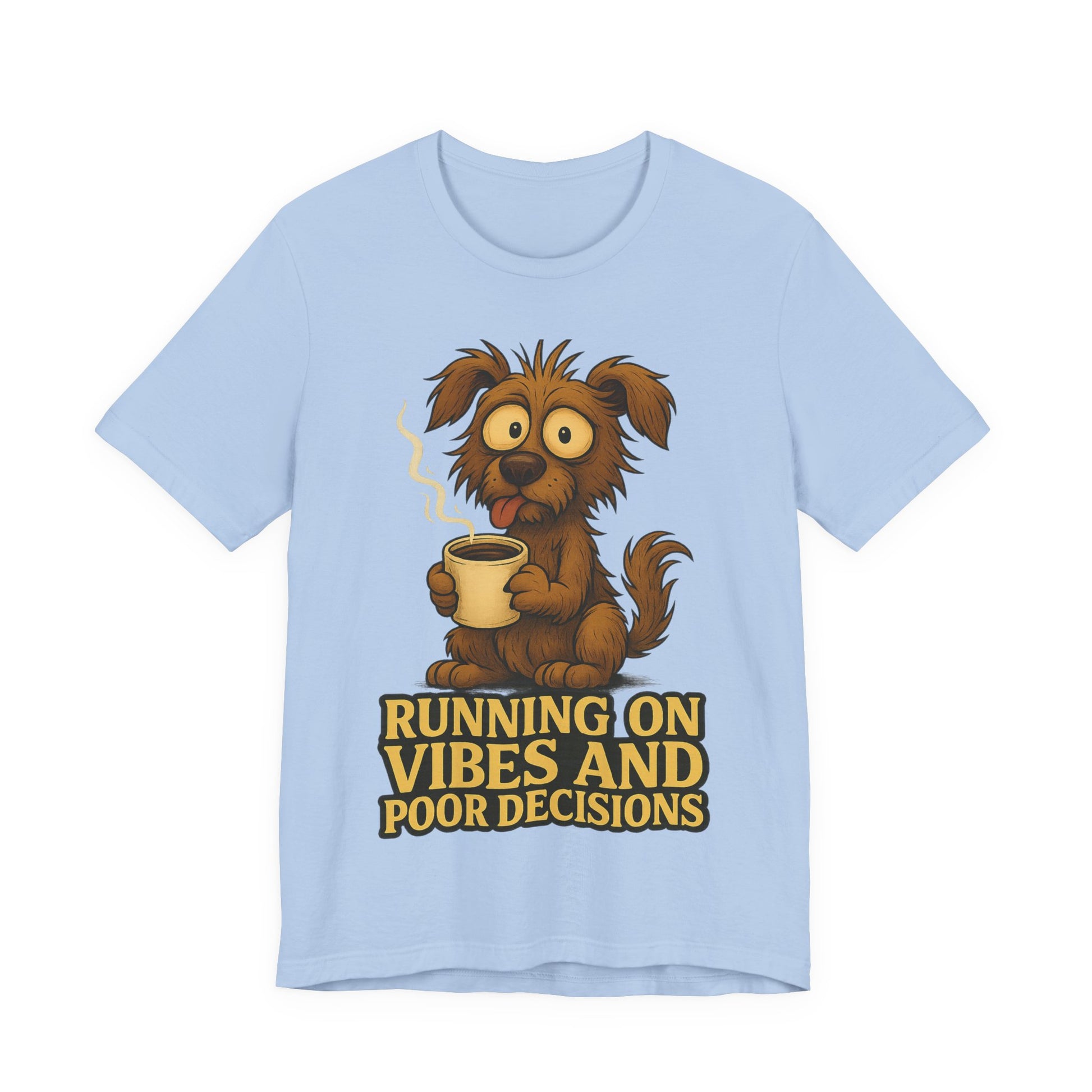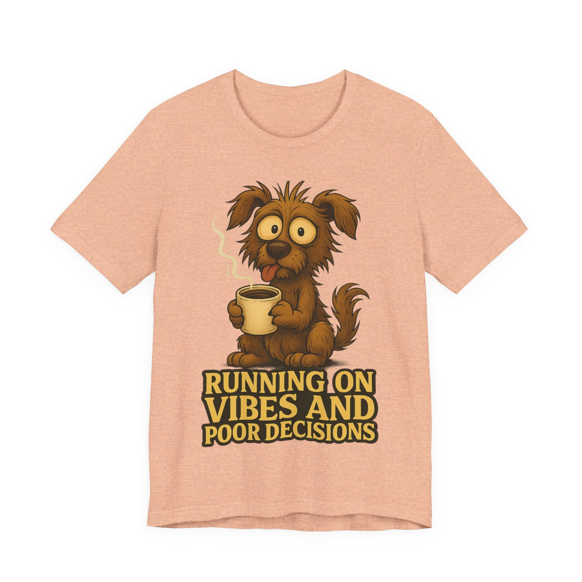 Running on Vibes and Poor Decisions Tee — Funny Coffee Dog Graphic T-Shirt