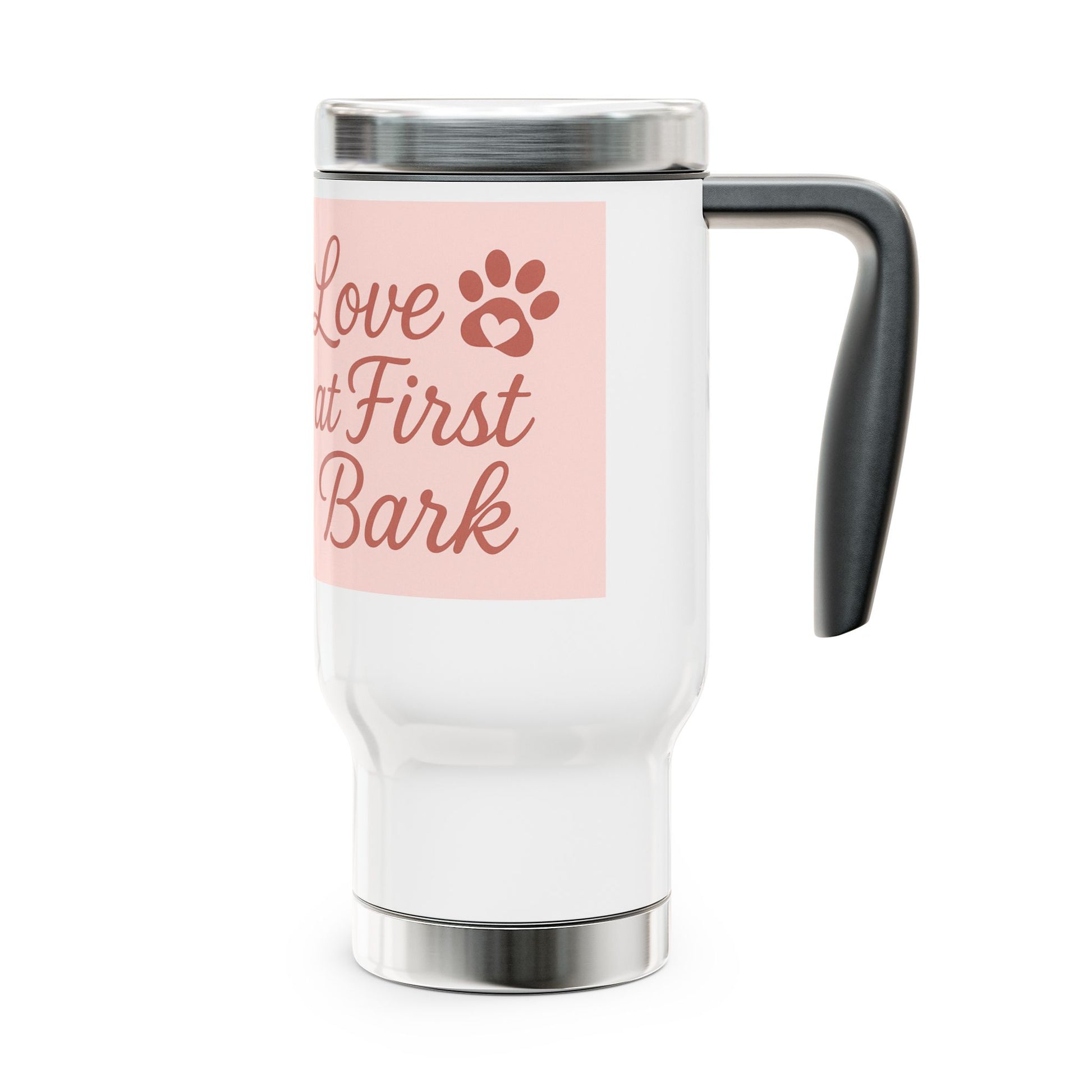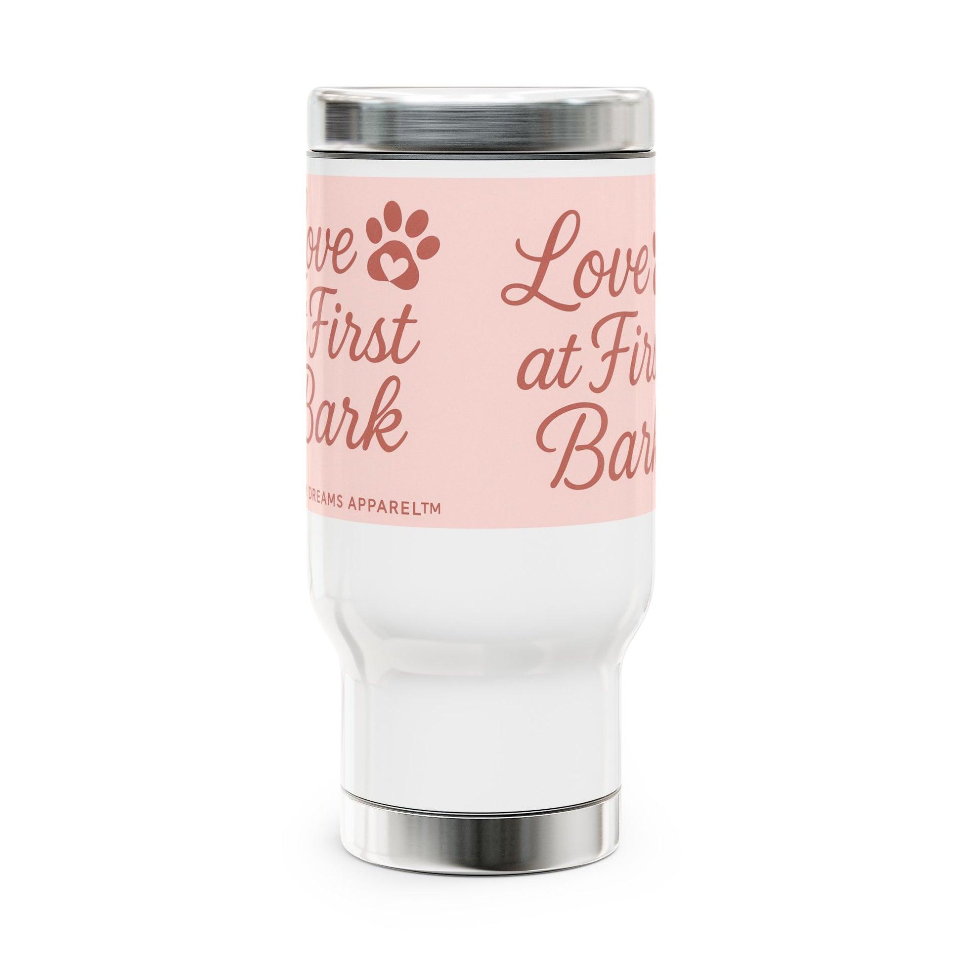 Stainless Steel Pet Travel Mug, Love at First Bark, Dog Lover Gift, Insulated Coffee Mug, Pet Parent Travel Cup, Fun Dog Themed Mug