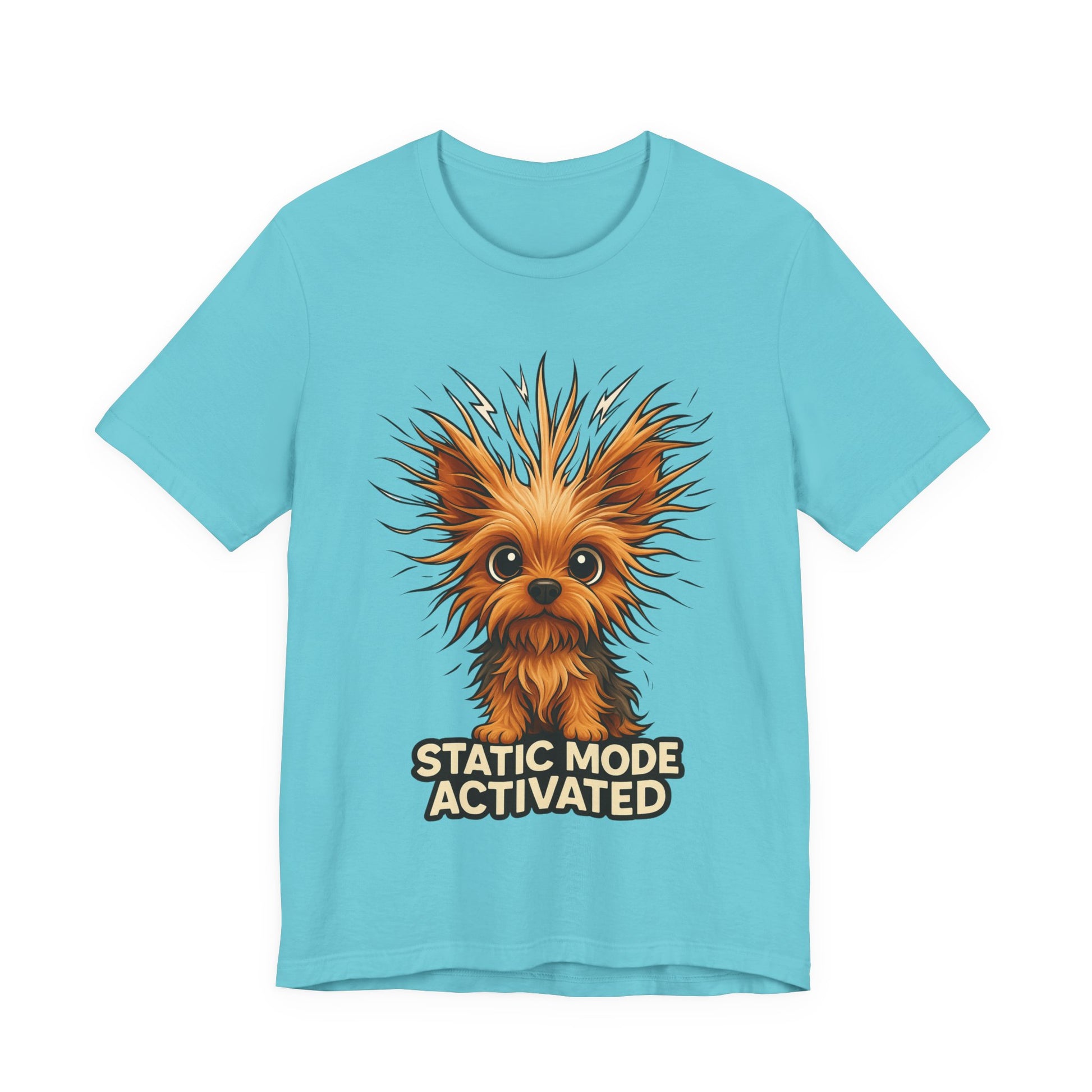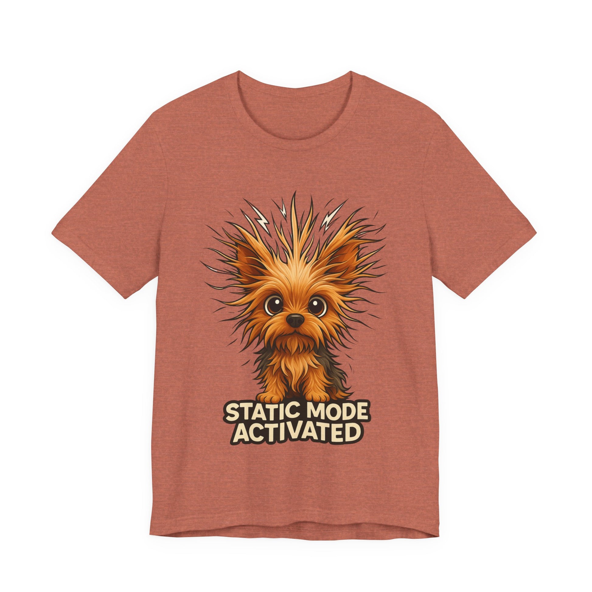 Feel the little electric thrill whenever you slip this tee on. A wide-eyed, scruffy pup with fur standing on end stares out from the chest with the playful caption “STATIC MODE ACTIVATED.” The lightweight, airy cotton keeps you comfortable while the bold, high-detail print stays crisp wash after wash. Wear it when you want to spark a laugh on walks, at casual meetups, or during cozy low-key days at home — it adds a cheeky, personable touch without shouting for attention.