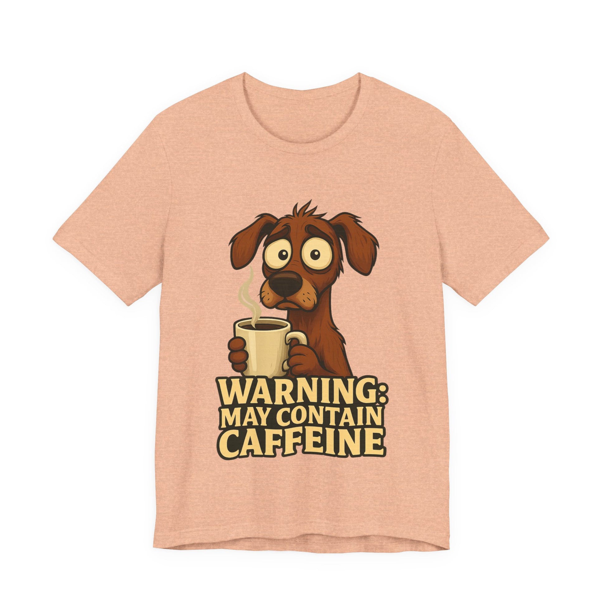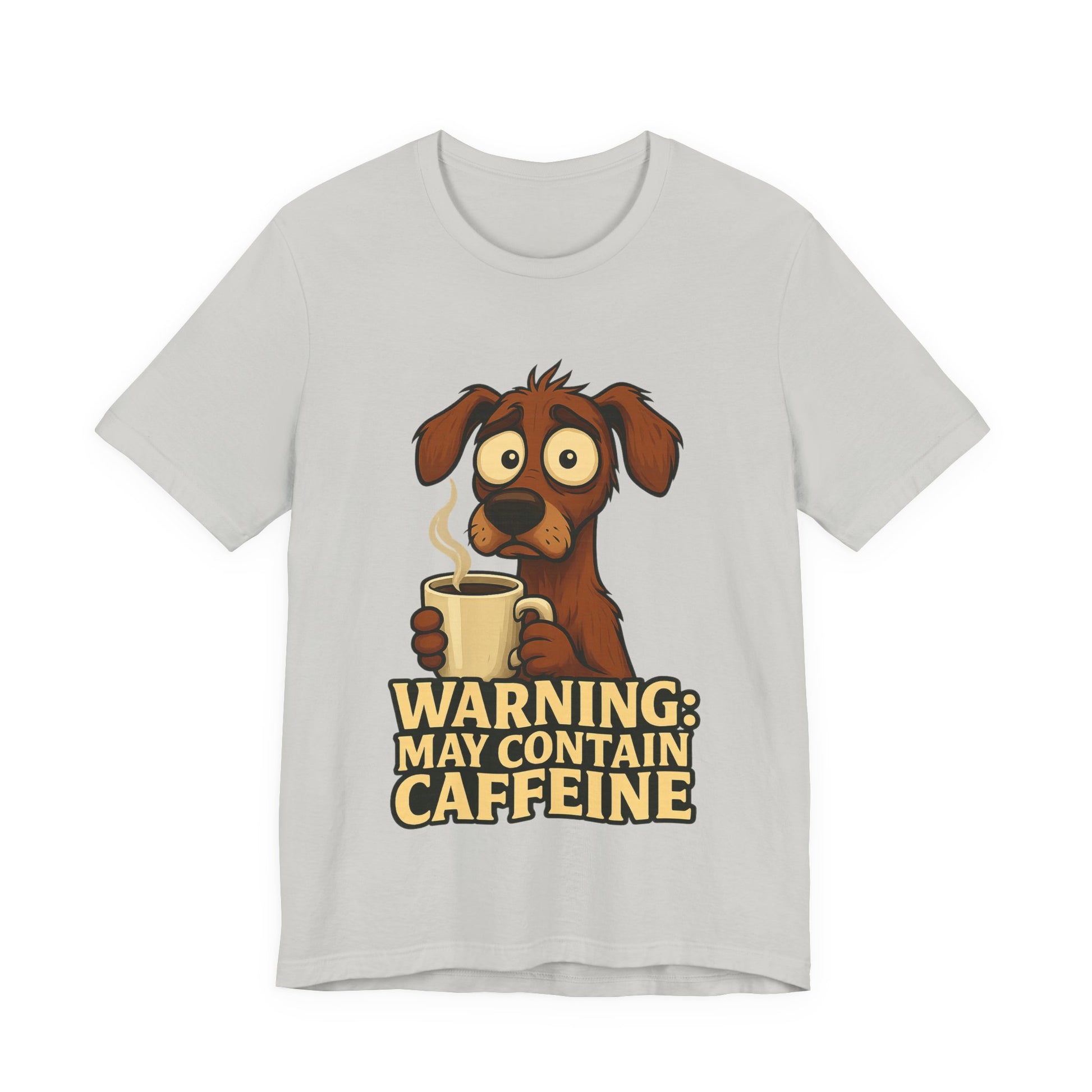 This lightweight jersey tee carries a playful, caffeine-fueled vibe — a cartoon dog clutching a steaming mug with the bold text “WARNING: MAY CONTAIN CAFFEINE.” It feels like that first laugh and first sip on a slow morning: wry, warm, and slightly wired. The breathable Airlume cotton keeps you comfortable whether you’re running errands, grabbing coffee with friends, or lounging at home. Subtle sleeve artwork adds an extra dash of personality without shouting. Wear it to spark smiles, start conversations, and celebrate the small, caffeinated rituals of everyday life.